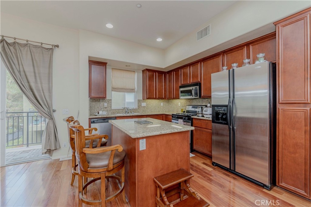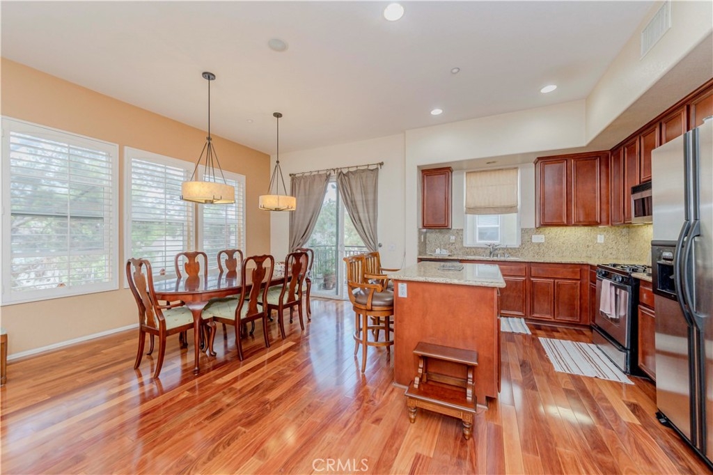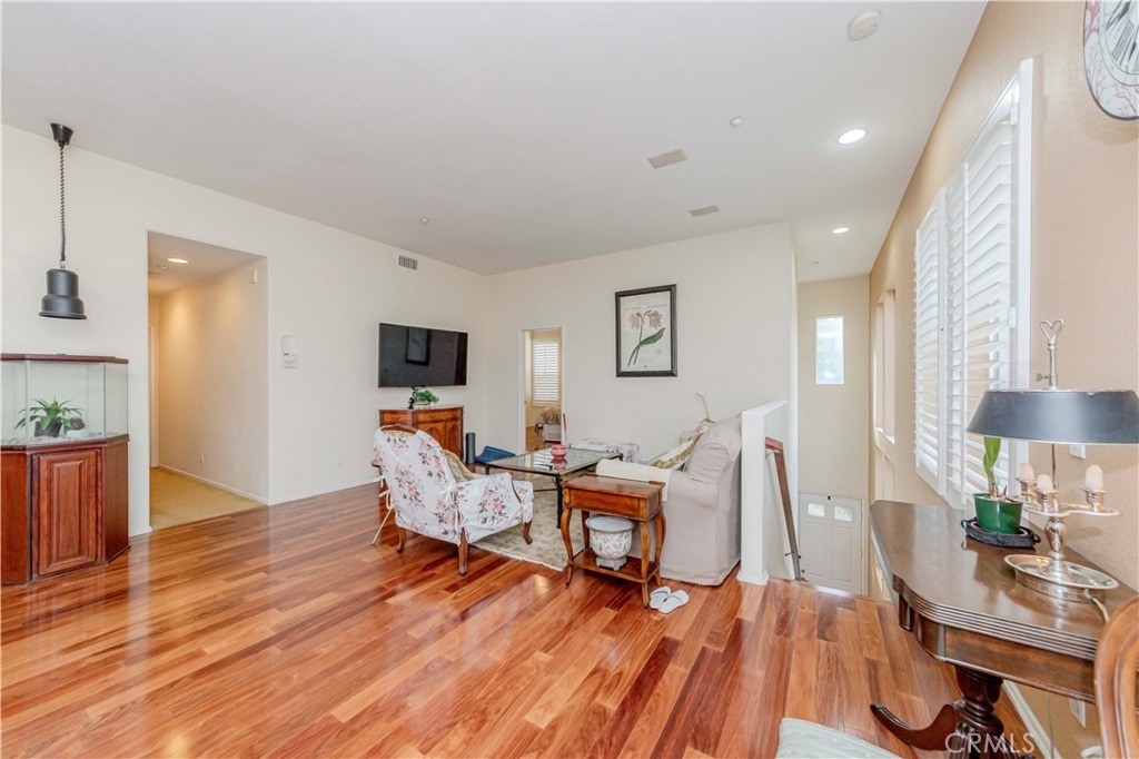 Beautifully Upgraded End-Unit Townhome with Treeline View in Amerige Heights! This highly upgraded 2-story townhome offers 3 spacious bedrooms and 3 full bathrooms, including a private en-suite bedroom with walk-in closet conveniently located on the first floor. Enjoy the bright and airy open layout with elegant wood flooring throughout, a gourmet kitchen featuring granite countertops, a center island, and a private balcony perfect for relaxing. The living room and primary suite are enhanced with a built-in sound system and wood shutters for added style and comfort. Additional highlights include an upstairs laundry room, direct access to a 2-car garage, and stunning treeline views. Located just a short walk to award-winning schools—Robert C. Fisler (K–8) and Sunny Hills High School—and close to shopping, dining, and the gym at Amerige Heights Town Center.