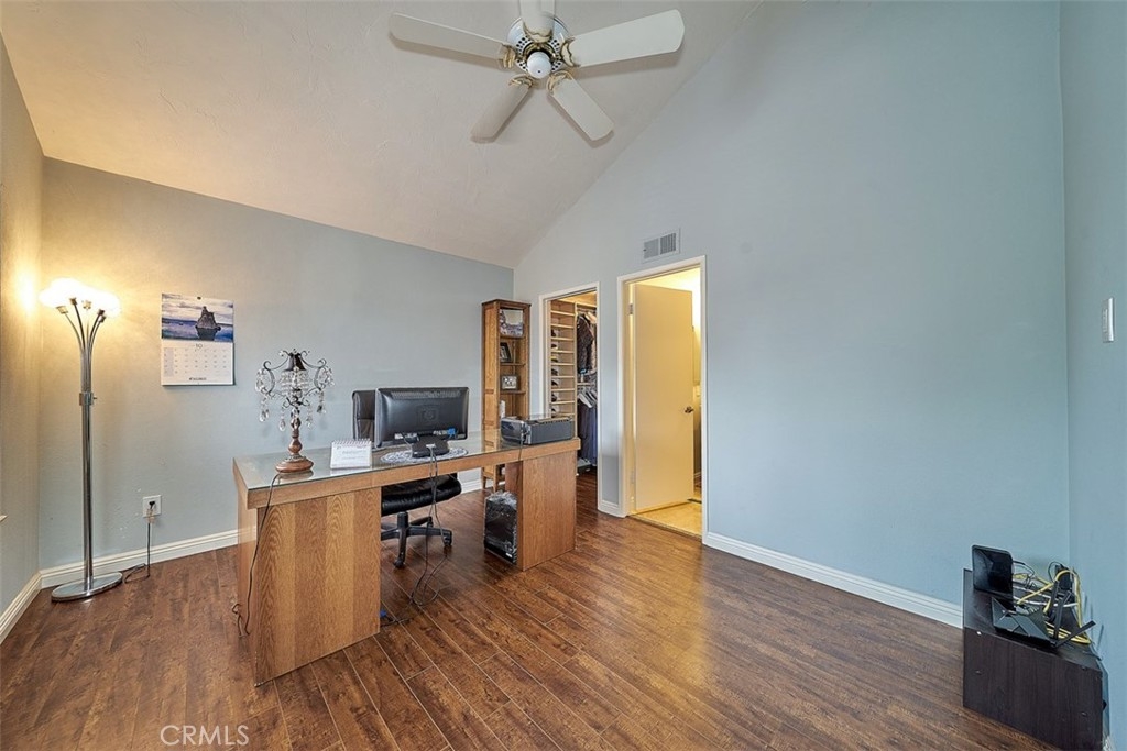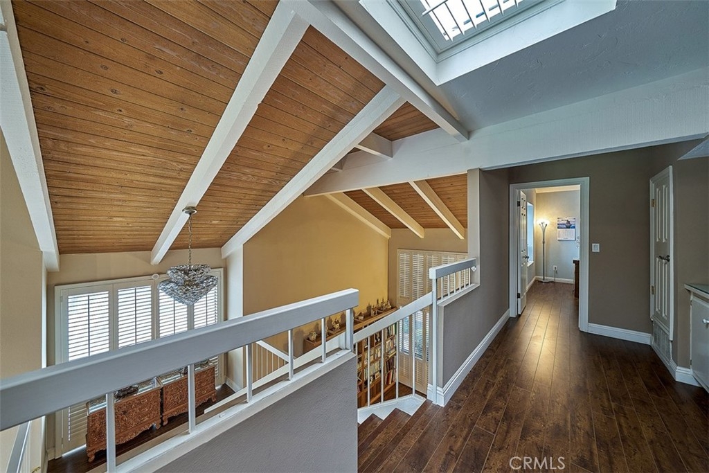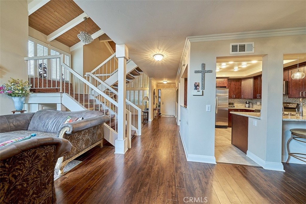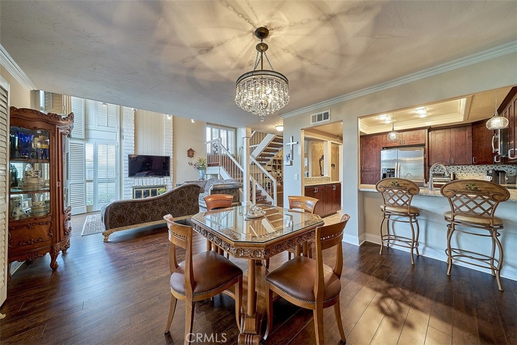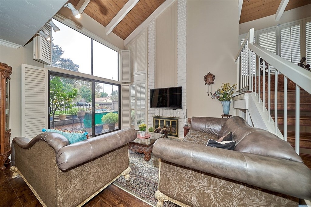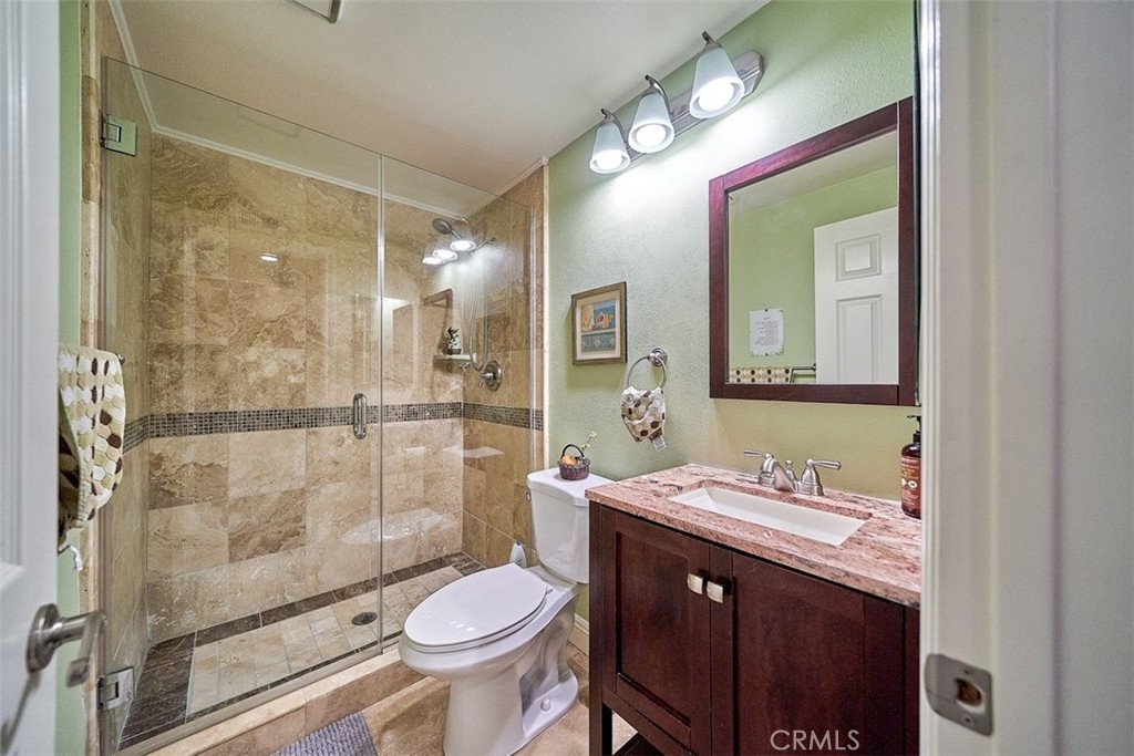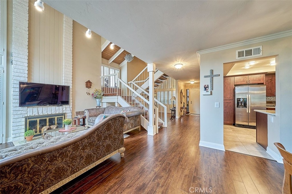 This beautiful end unit home located in 24 hours guard gated community. Airy floor plan and natural light through a good size of glass window makes living room very bright. Main floor spacious living room with fireplace that leads to a cozy dining area. Bedroom and bathroom at main floor is even useful. Beautifully remodeled kitchen with granite countertops and stainless steel refrigerator, washer and dryer included. Master bedroom with cathedral ceilings and stunning view with a private balcony, walk-in closet, and spacious bathroom with dual sink. Relax and enjoy well grown plants at patio back yard. The community offers two pools, spas, tennis courts, club house, RV parking. Attached two-car garage. Close to Hospital, shopping and entertainment.
