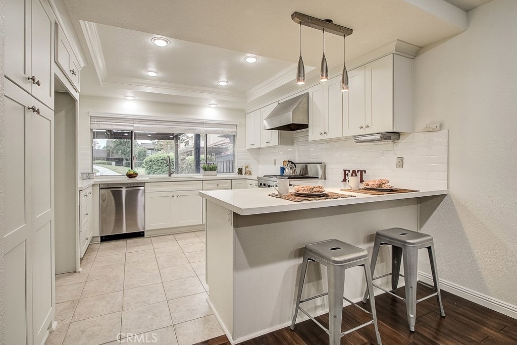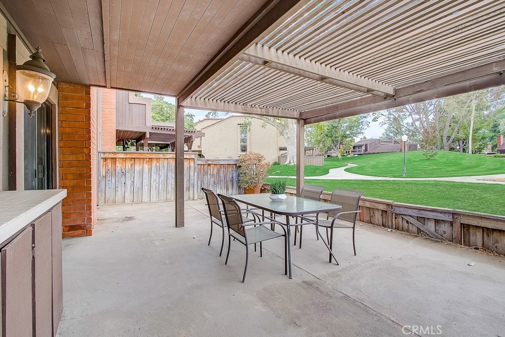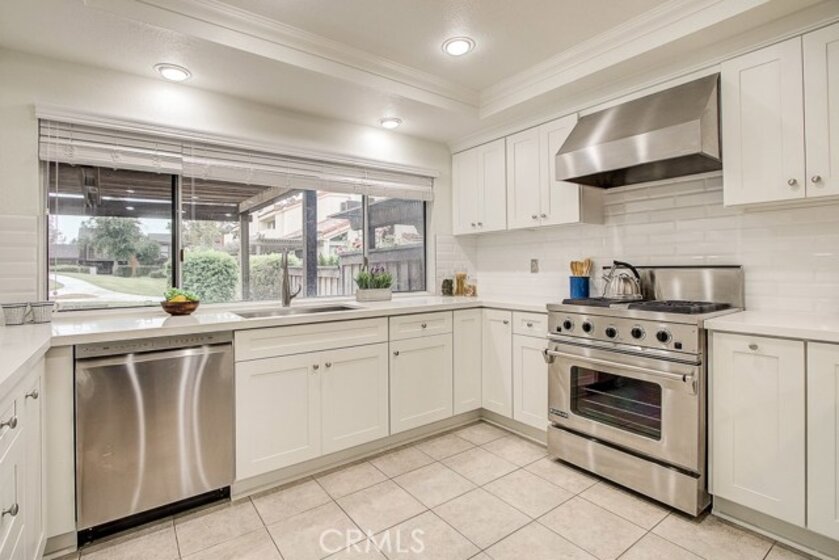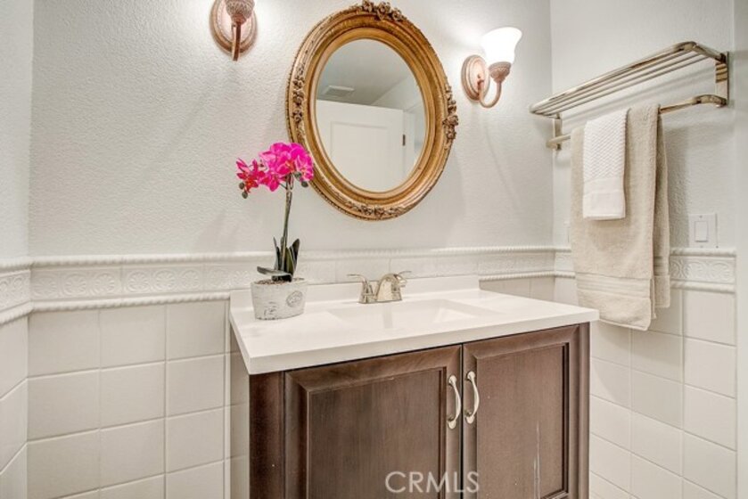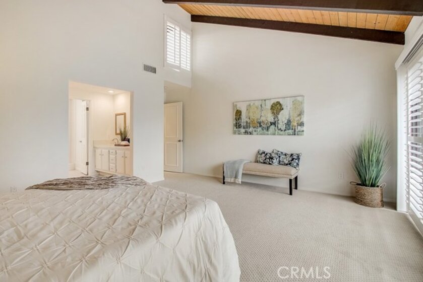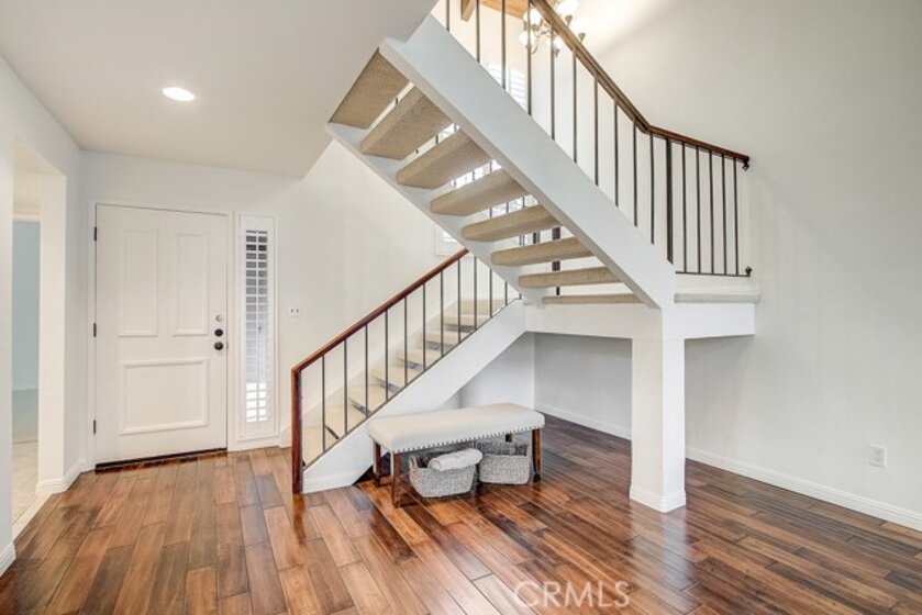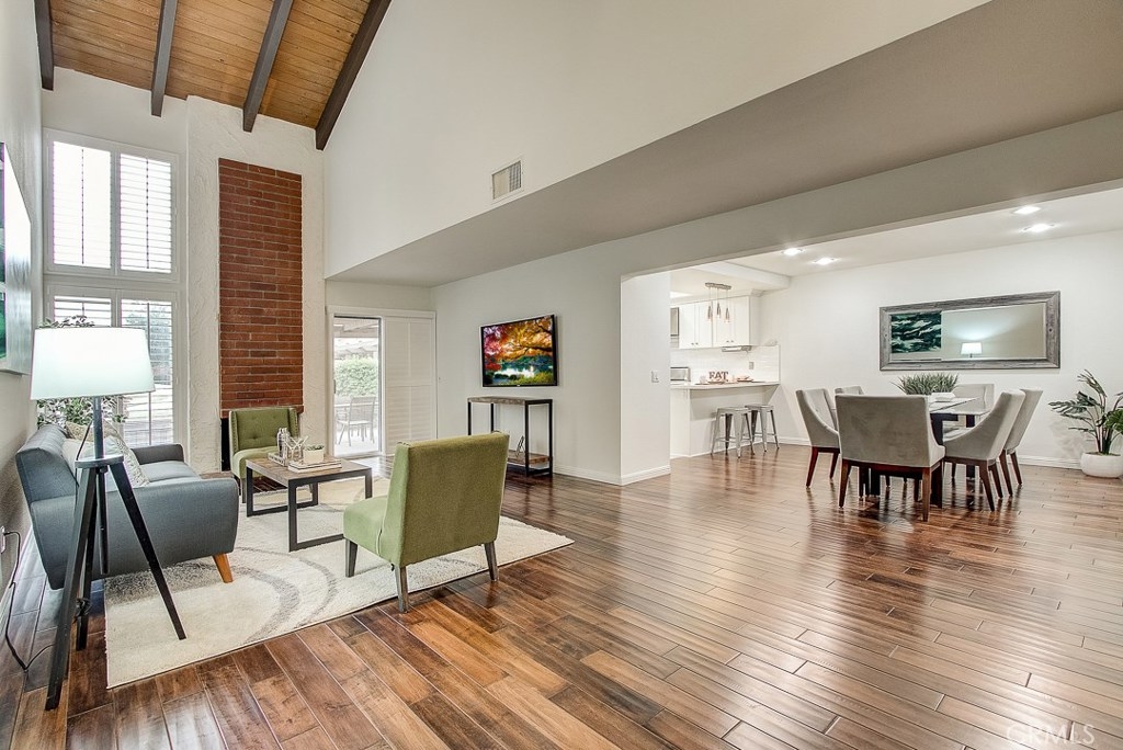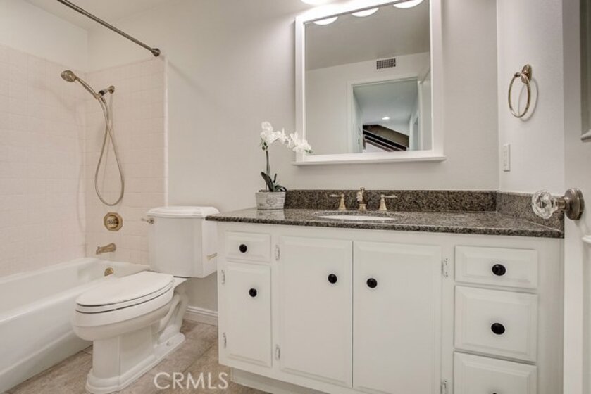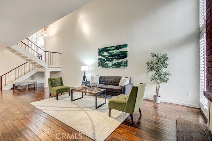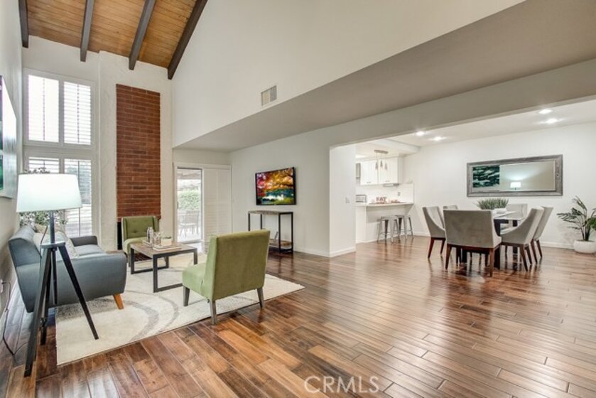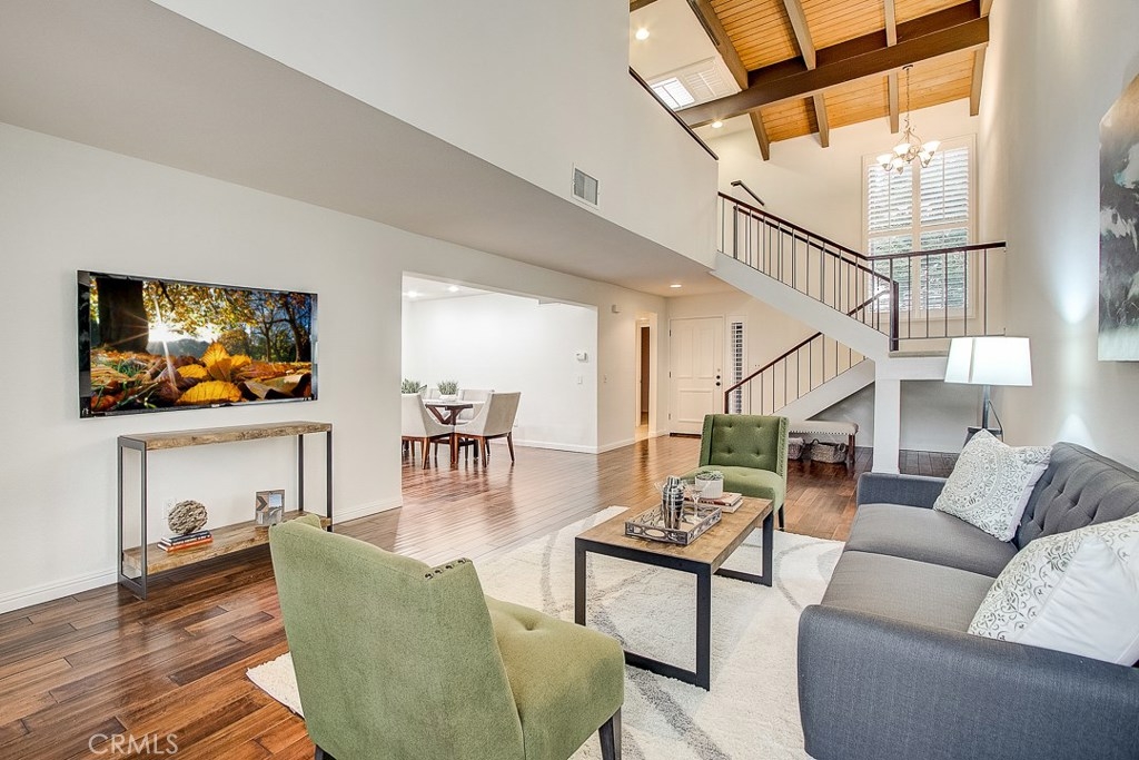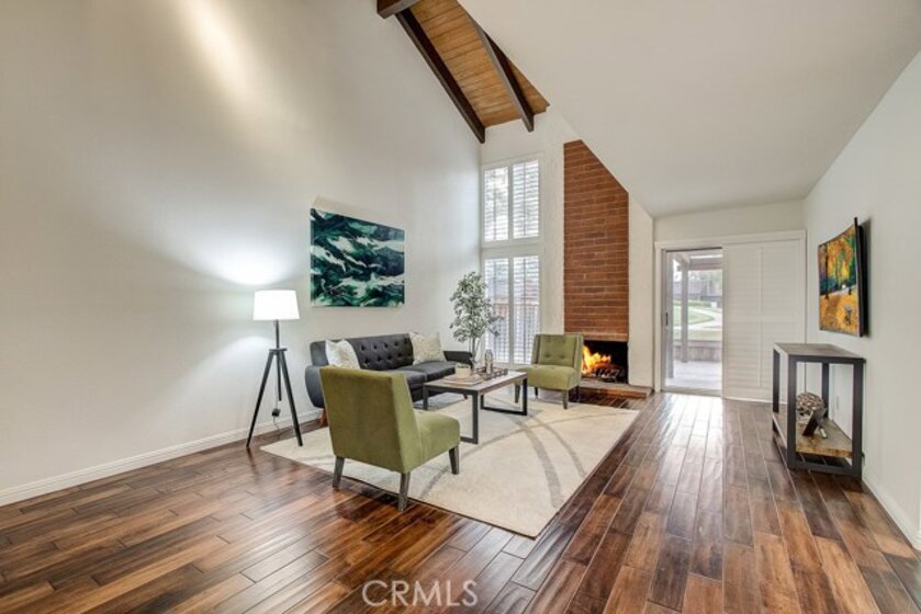 Meticulously maintained, this guard-gated Fairway Village home is ready for its new owners. Vaulted ceilings with wood beams, fresh neutral paint and a cozy fireplace in the spacious living room add to the elegance of this highly desirable floor plan. The sumptuous remodeled kitchen is well-appointed with marble counters, white cabinetry, new stainless steel appliances, a generous pantry,recessed lighting, and a breakfast bar with pendant lights and seating. The adjacent dining room has recessed lighting and rich wood laminate floors that flow into the living room. A convenient downstairs bedroom with full bathroom is perfect for guests. Up the open staircase, the master suite welcomes with a sizable closet, ceiling fan, a private balcony, and a spa-quality bathroom with dual mirrored vanities. The secondary bedrooms have spacious closets and share the full hall bathroom. Enjoy relaxing in the backyard with hardscape, cement patio with awning. HOA amenities include, guard-gated community, two sparkling pools, a clubhouse, BBQ area, green belts and trails, and basketball and tennis courts. Neighborhood amenities include the highly sought after Beechwood Elementary School and Fullerton High School. Close proximity to Fullerton College, Cal State Fullerton, Fullerton Golf Course, shops and restaurants.