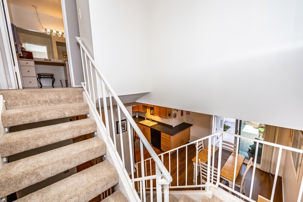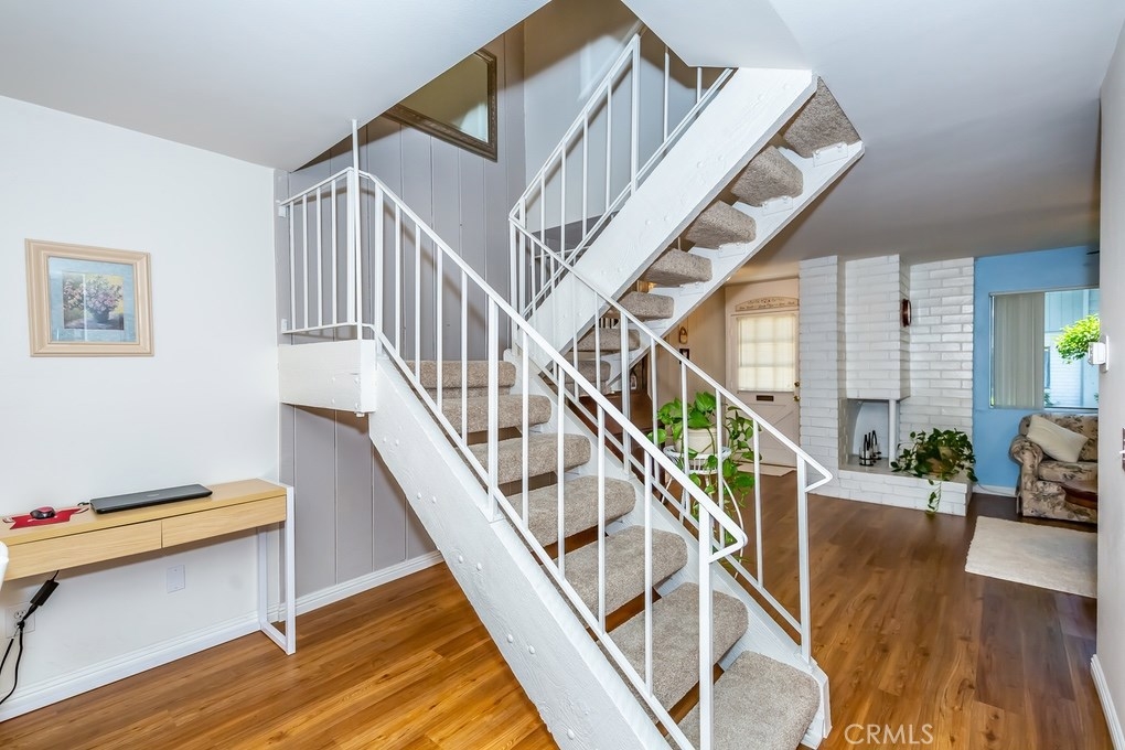 If you are a first-time home buyer or investor thinking you have been priced out of the Orange County home market-think again! Nestled in the Foothill Village Townhome Community, in Fullerton, this 2 bedroom 1.5 bath home offers an amazing value to some lucky buyer. This townhome has a generous interior sq. footage of 1210 sq. feet with a lovely exterior patio. As you enter the home you are greeted with an accent wall of Vertical Batten Board that extends through the entry and continues to the 2 story wall of the open staircase. The living room includes a wood burning fireplace and views to the greenbelt with 4 mature trees offering shade and a tranquil pathway. Downstairs also includes a half bath, dining area and kitchen. You have multiple storage opportunities with a hall closet and European Maple Cabinets in the kitchen. The dining area overlooks the enclosed patio. The patio offers a private area to enjoy the outdoors and, off the patio, is the single car garage with washer and dryer hook ups. Back inside as you ascend the open staircase you will find the full bath that includes a separate bath and shower. The large Master Bedroom enjoys a wall of mirrored closets, including full length closet organizers. The generously sized secondary bedroom, down the hall, has a spacious walk-in closet. Both the high end laminate floor downstairs and the carpet upstairs have been upgraded within the last 2 years. Come visit us early so you can make this amazing townhome your own!