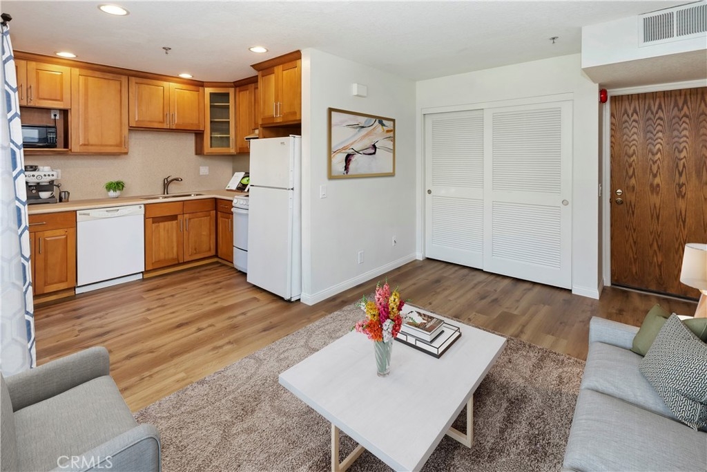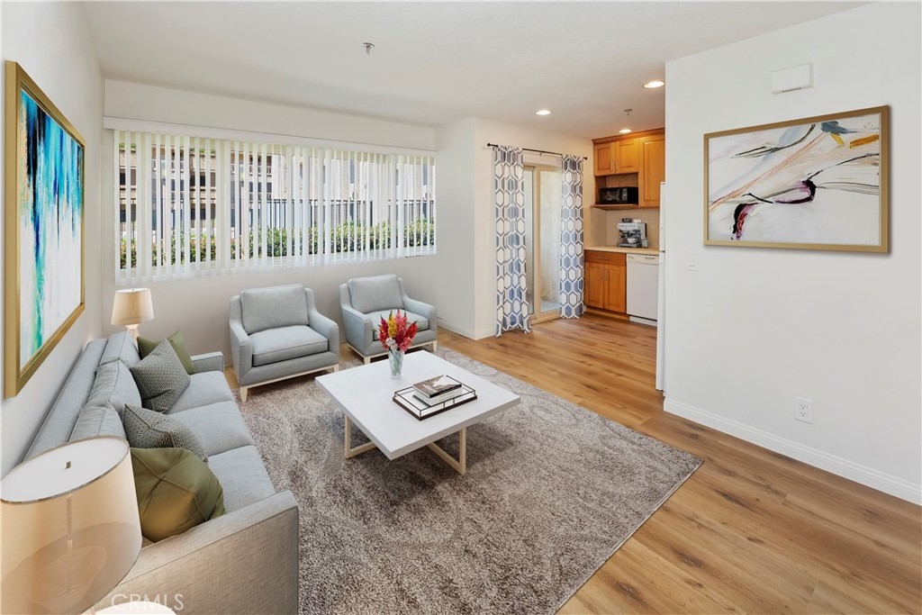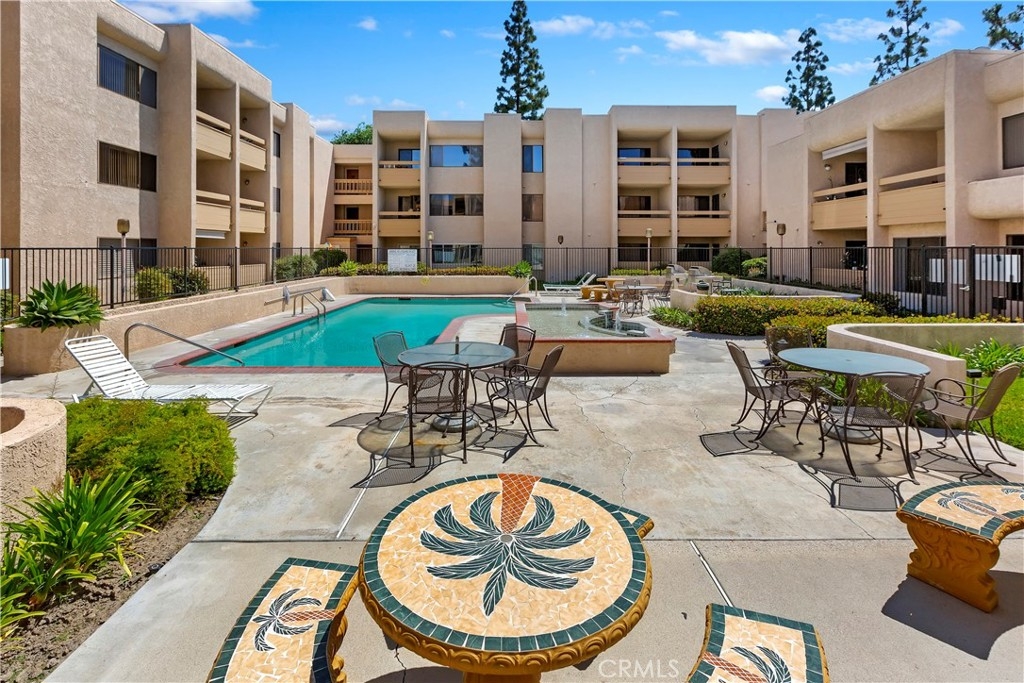**Turnkey** **Ground Floor** **No Stairs** Rarely Available and Updated Ground-Floor Unit in Active 55+ Community! Centrally located in the amenity-rich community of The Fullerton Fountains, this 1BR/1BA, 462sqft condo stuns with an open floor plan, faux wood flooring, a neutral color scheme, a sizeable living room, and a fully equipped kitchen featuring white appliances, wood cabinetry, granite countertops, and a sliding glass door to the outdoor space. Offering a lovely space for morning coffee, the covered patio boasts serene views of the courtyard. Take advantage of the many community amenities, which include a pool, spa, BBQ area, game room, and a lounge. Abundantly sized for comfort, the bedroom has a large, mirrored closet, while the full bathroom accommodates with an oversized storage vanity and a shower/tub combo. Other features: gated parking, community laundry, low HOA, blocks to the Fullerton Library and Fullerton Community Center, near Downtown dining and shopping, and more! Come See Now! (Some photos have been virtually staged with furniture)