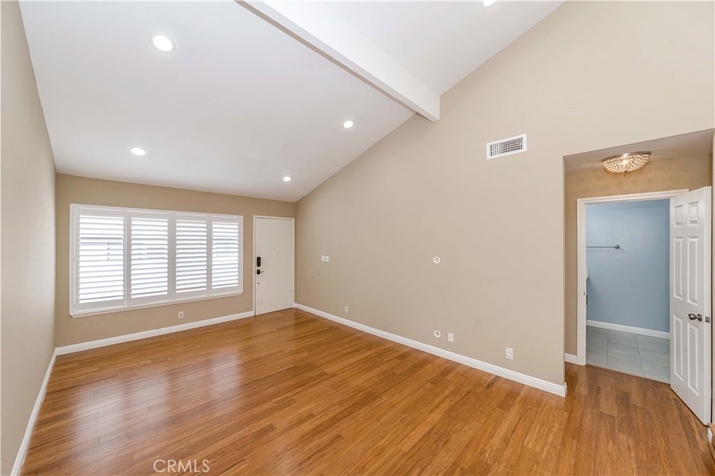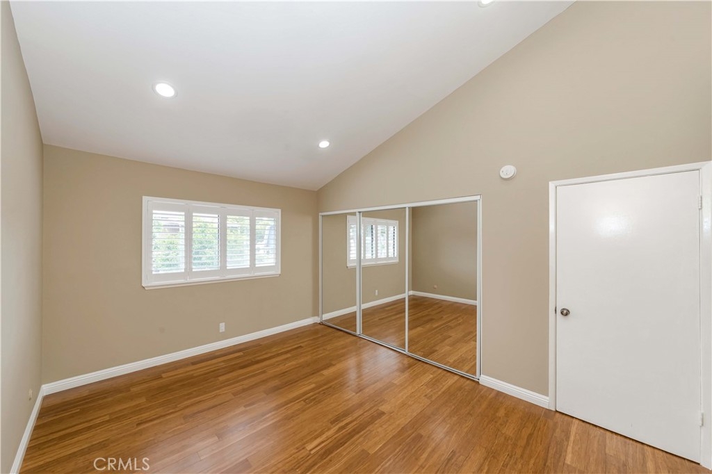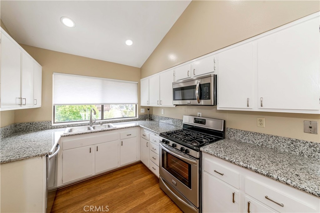 Upgraded townhouse in a quiet interior location. Split-level floorplan(almost single story) with no one above or below. 2 generous sized bedrooms & 2 bathrooms with open and bright floorplan, cathedral ceilings, bamboo flooring throughout, scraped ceilings, recessed lights, skylight, plantation shutters. Spacious kitchen with granite countertops, stainless steel appliances & eating area. The master bedroom has vaulted ceilings & large mirrored closet doors. Both bathrooms have been totally updated with no detail overlooked. Central A/C and upgraded furnace. Direct access to the 2 cars garage & laundry(gas and electric). Award winning schools (Sunset Lane Elementary, Parks Junior & Sunny Hills High School). Low association dues ($245.00) include water/trash/fire insurance/all outside maintenance. outstanding neighborhood, within walking distance to the schools, parks, and prestigious Amerige Heights Town Center