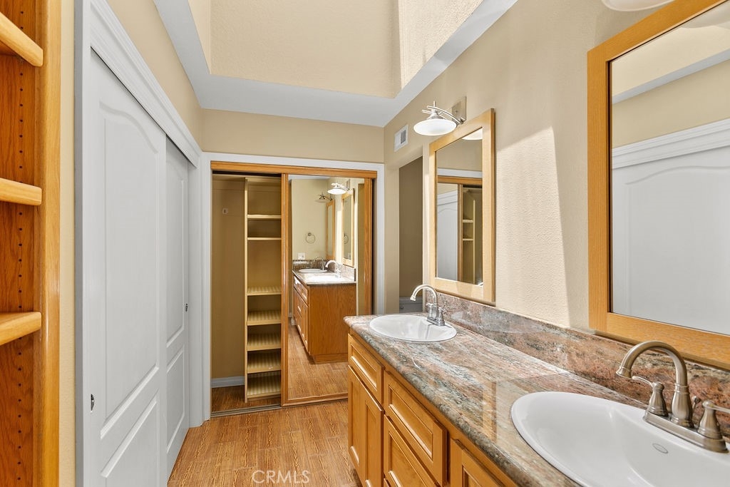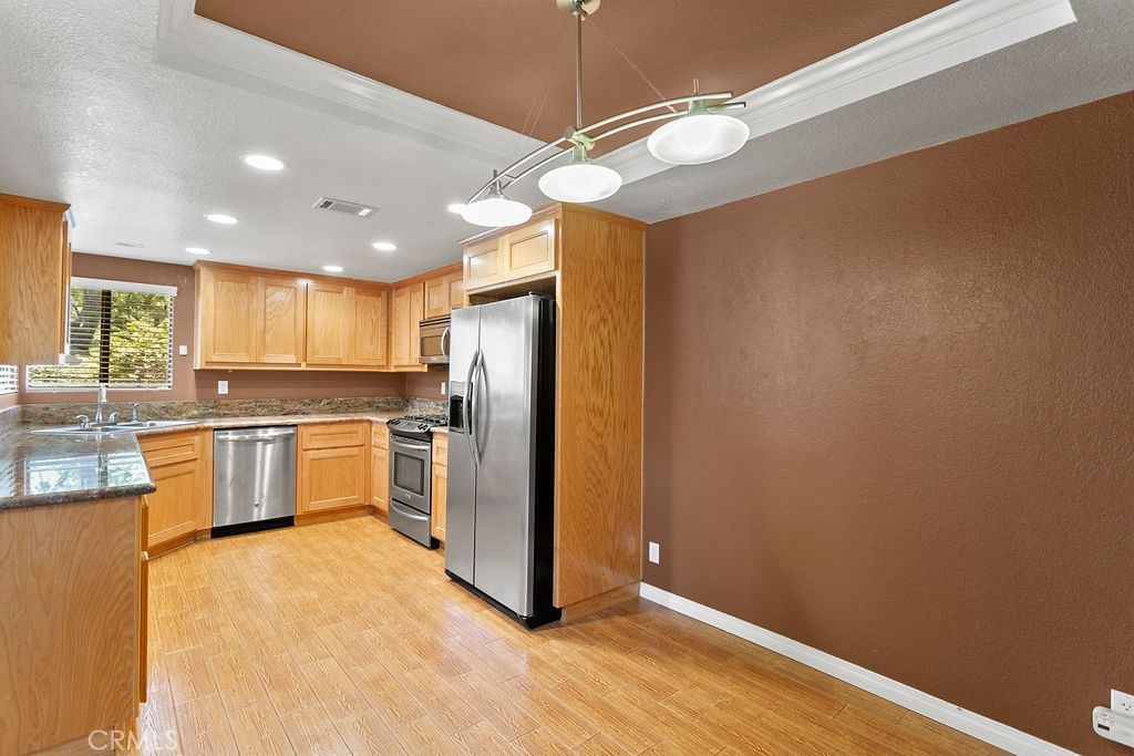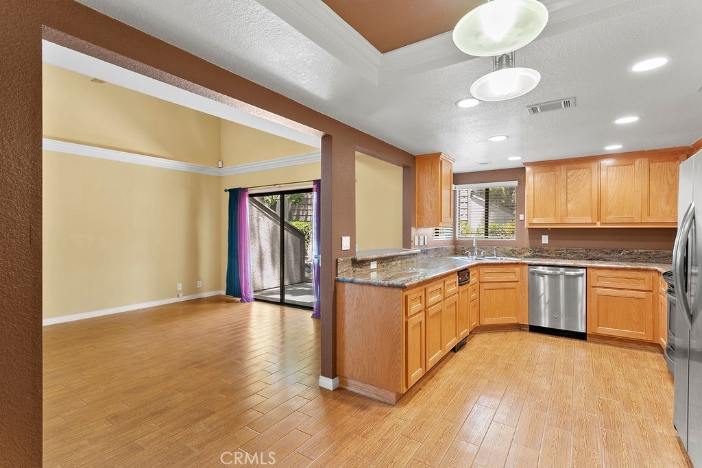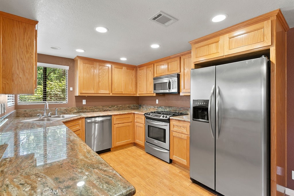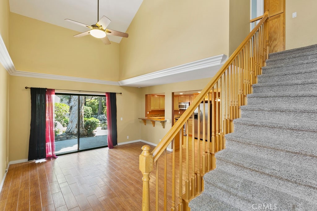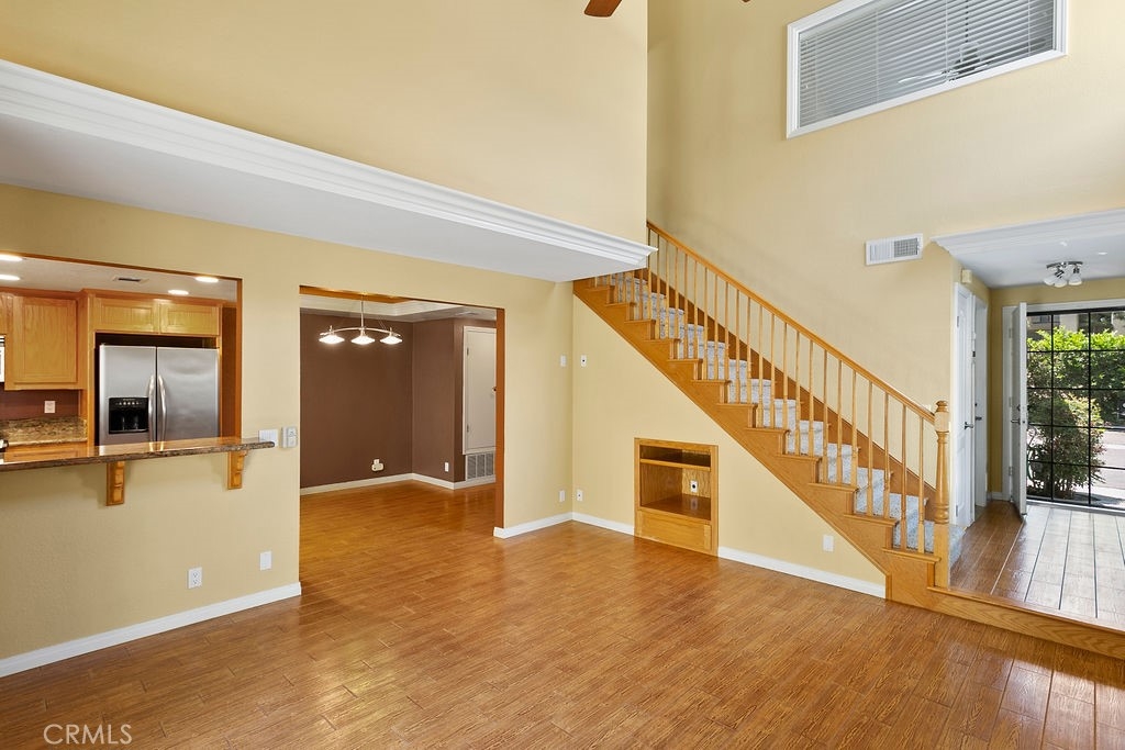 You cannot ask for a better location or a nicer community. This Hidden Lakes gem provides an end-unit location and sits right on the creek, where you can hear the flowing sounds of the water. This floorplan has been upgraded and modified to create an open layout where the kitchen, dining, and living areas incorporate into an inviting entertaining space. The living room has vaulted ceilings and a slider leading to the rear patio. The kitchen opens up to the living room and is highlighted by the upgraded cabinetry, granite counters, recessed lighting, and stainless-steel appliances. Dining options include the formal dining area as well as the breakfast bar. Storage cabinets/pantry area and a half bath complete the lower level of the home. The upper level is comprised of a master suite and an additional bedroom with a private full bath (both with vaulted ceilings). The master bedroom boasts access to a private balcony (with views/sounds of the creek below) as well as an attached bath with dual-sink vanity, granite counters, double closets, a walk-in shower, and a skylight that fills the room with natural light. Additional features include central heating and A/C, 2-car attached garage with direct access, and laundry area. The Hidden Lakes community offers a pool/spa area and tennis courts, and is conveniently located near Cal State Fullerton, Fullerton College, Fullerton Golf Course, shopping, restaurants, and freeway access.