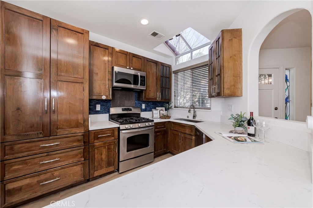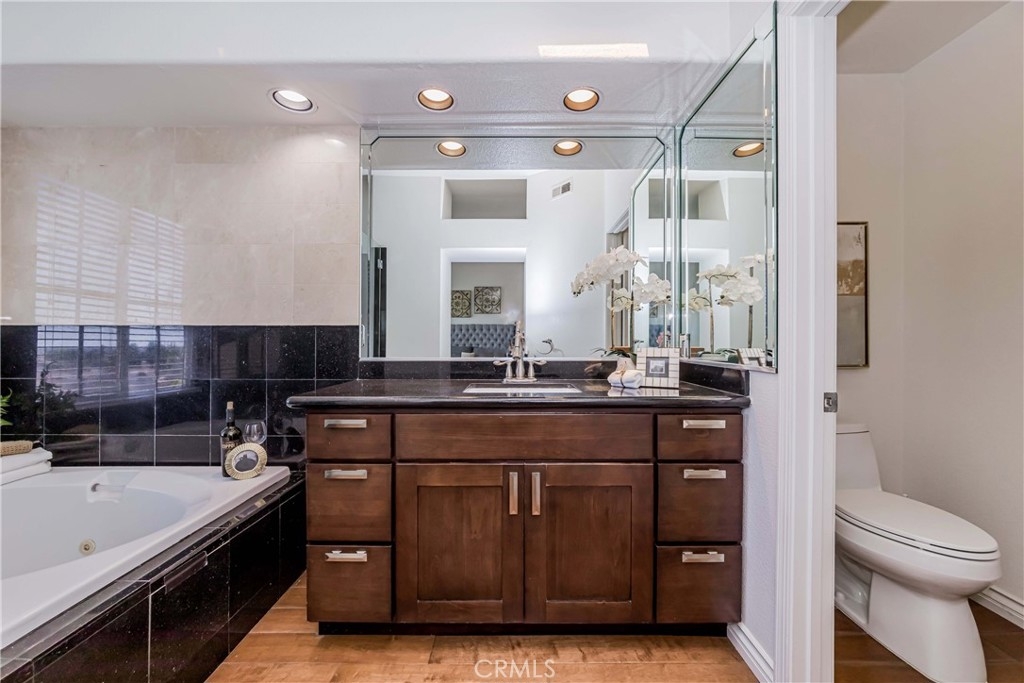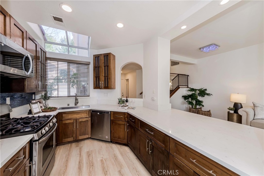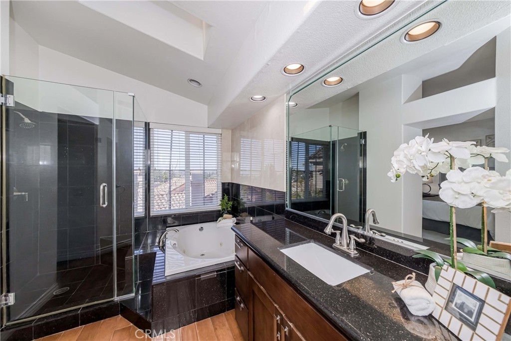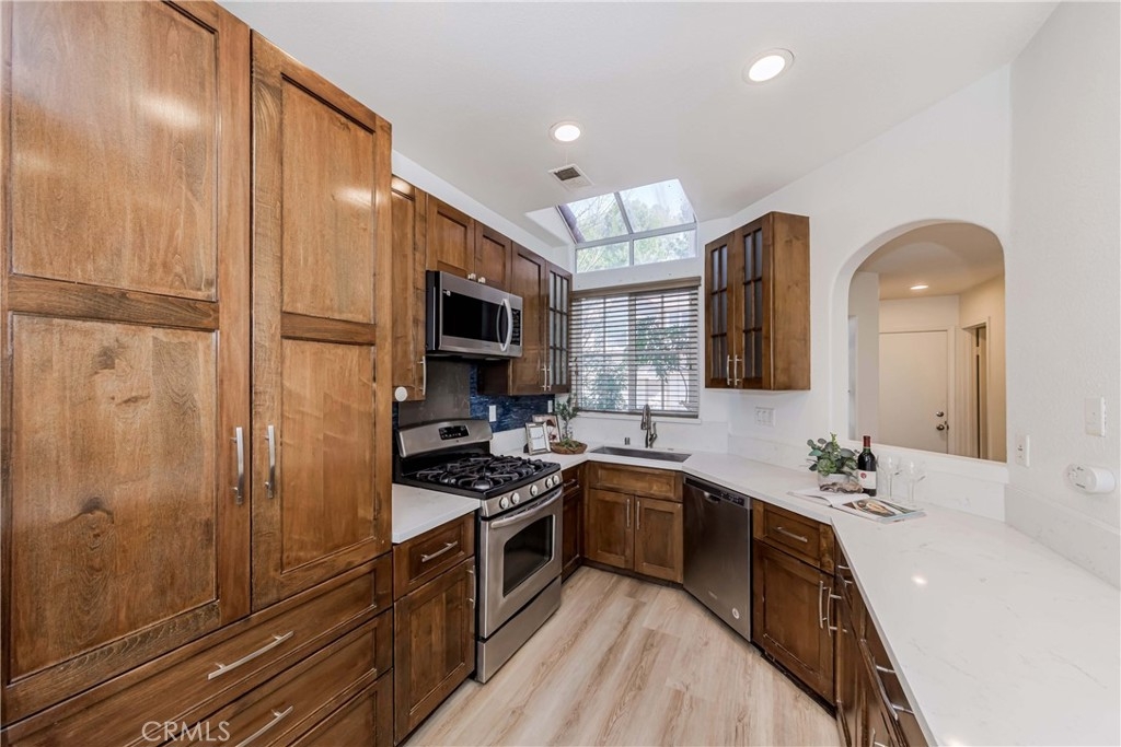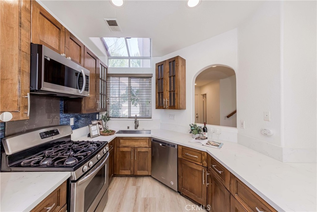 Welcome to this exquisite townhome sits on a premium location overlooking city light VIEW in desirable Maison De Fleur community. Situated at the top of the hill in the back of the complex, this home is attached on only one side, providing a sense of privacy. The private entry and location make this unit feel more like a house than a condo. This modern two-story residence boasts an open floor plan with no one above or below, complemented by large windows that fill the interior with natural light. The spacious living room features stunning engineerwood flooring and a dual-sided fireplace, perfect for cozy evenings. The remodeled kitchen features quartz countertops, stainless steel appliances, custom cabinetry and a breakfast bar. Adjacent to the kitchen, the formal dining area with a solarium window provides a wonderful space for entertaining family and friends. Upstairs you’ll find a private Master Suite with city views, bathroom with sinks, oval tub, separate shower and a walk-in closet. Across the hall are two spacious secondary bedrooms and another full bathroom.The convenient upstairs laundry with full size washer and dryer. The home boasts direct access to your two car garage - plus just a few steps away you’ll find guest parking. The community amenities includes Pool, Spa and Playground. This beautiful home is centrally located near shopping, restaurants and the 105 acre Ralph Clark Regional Park that is just across the street. Must See !!!