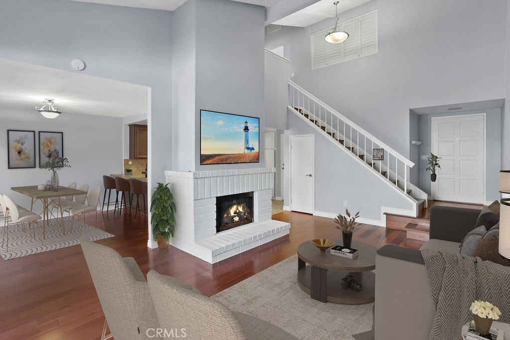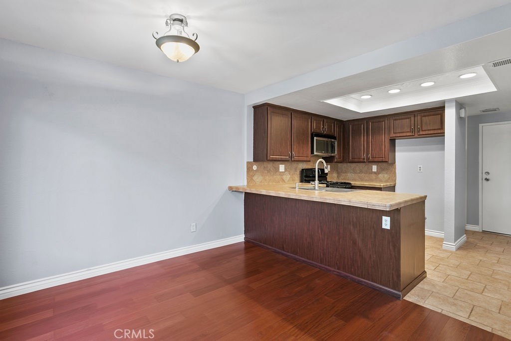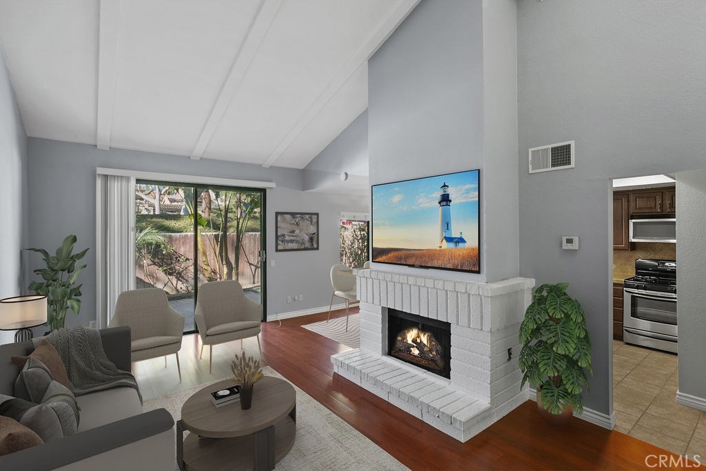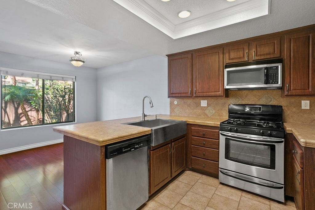 Welcome to this charming 2 bedroom and 2.5 bath condo located in the highly desirable Malvern Creek community. The inviting living room features a high ceiling, cozy fireplace, and access to the private backyard. The kitchen is designed with tile flooring, tile countertops and backsplash, recessed lighting, stainless steel appliances, brand new stainless steel farmhouse sink, and opens to the dining room. The spacious master bedroom features a high ceiling with a ceiling fan, a walk-in closet, and an en suite bathroom. Additional features include fresh interior paint, laminate flooring throughout, direct access 2-car garage, and LED lighting. HOA amenities include a community pool and spa. This prime location is located conveniently across the street from the Amerige Heights Town Center and attends award-winning Sunny Hills High School and Fisler Elementary (K-8).