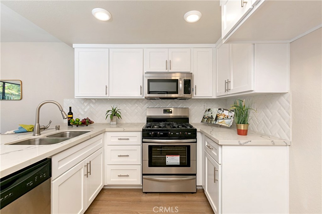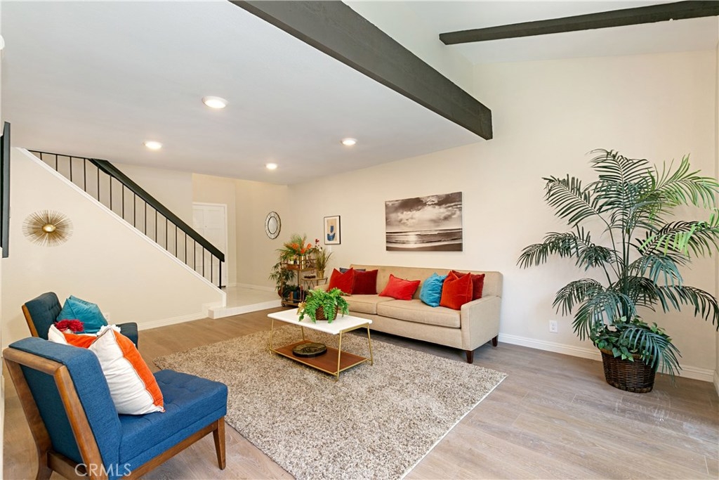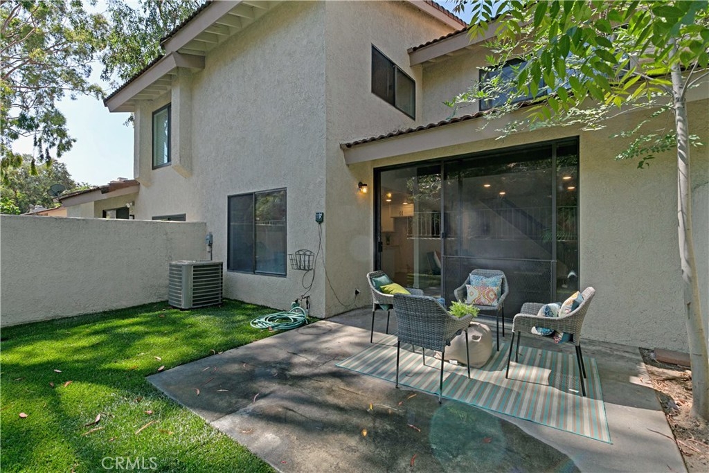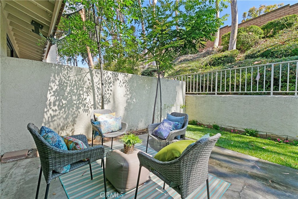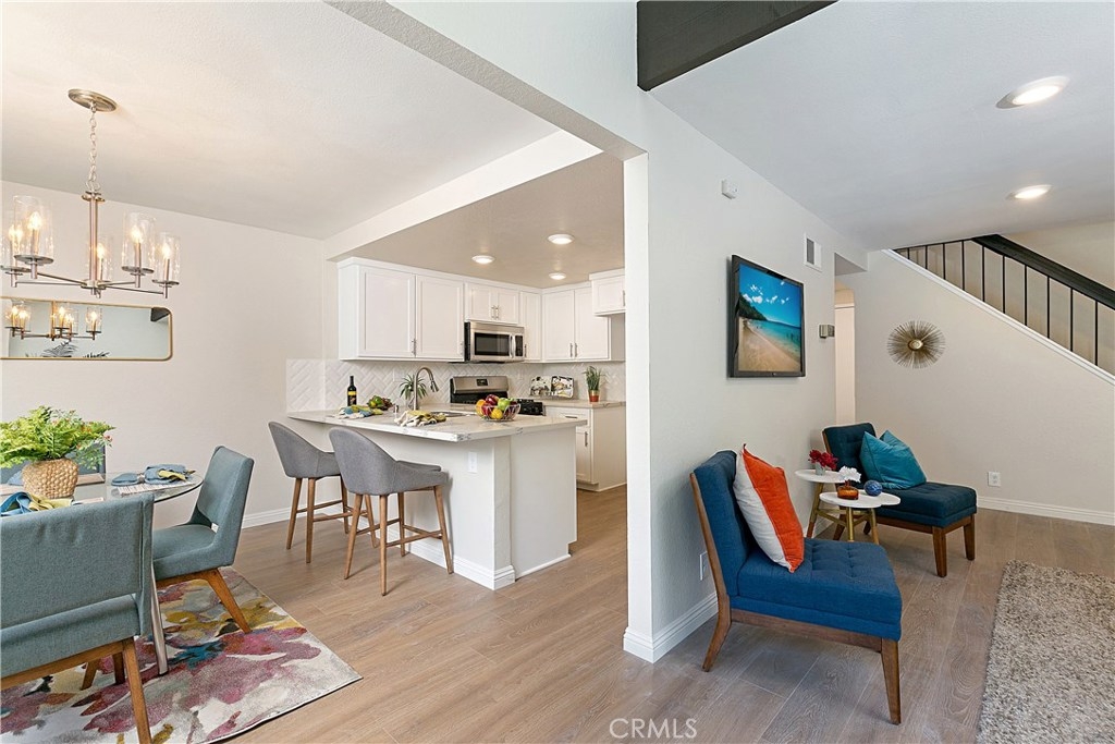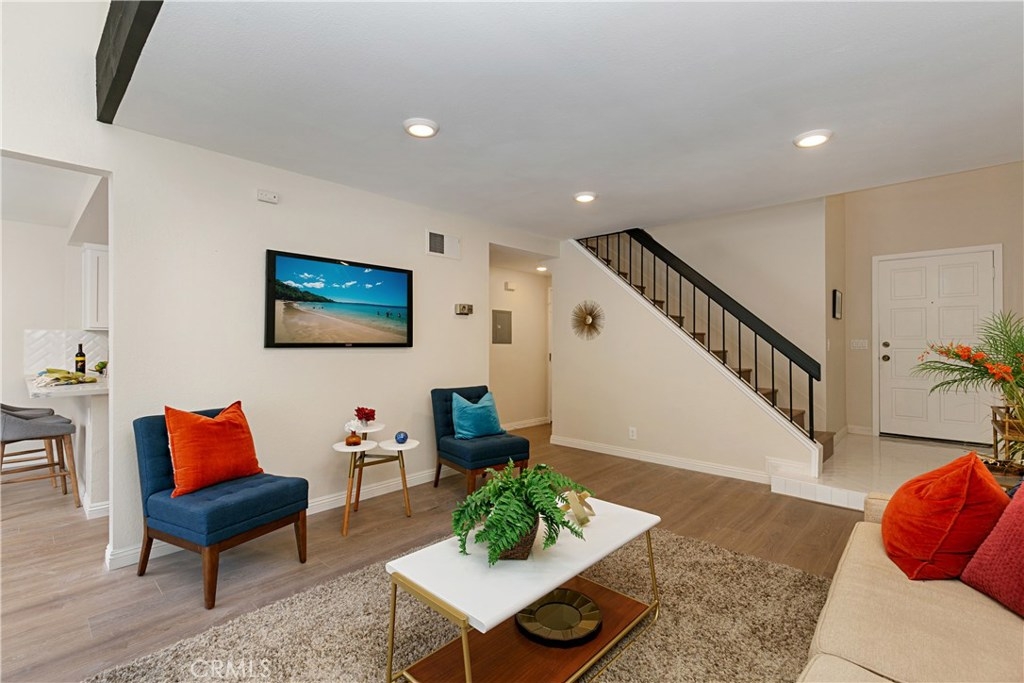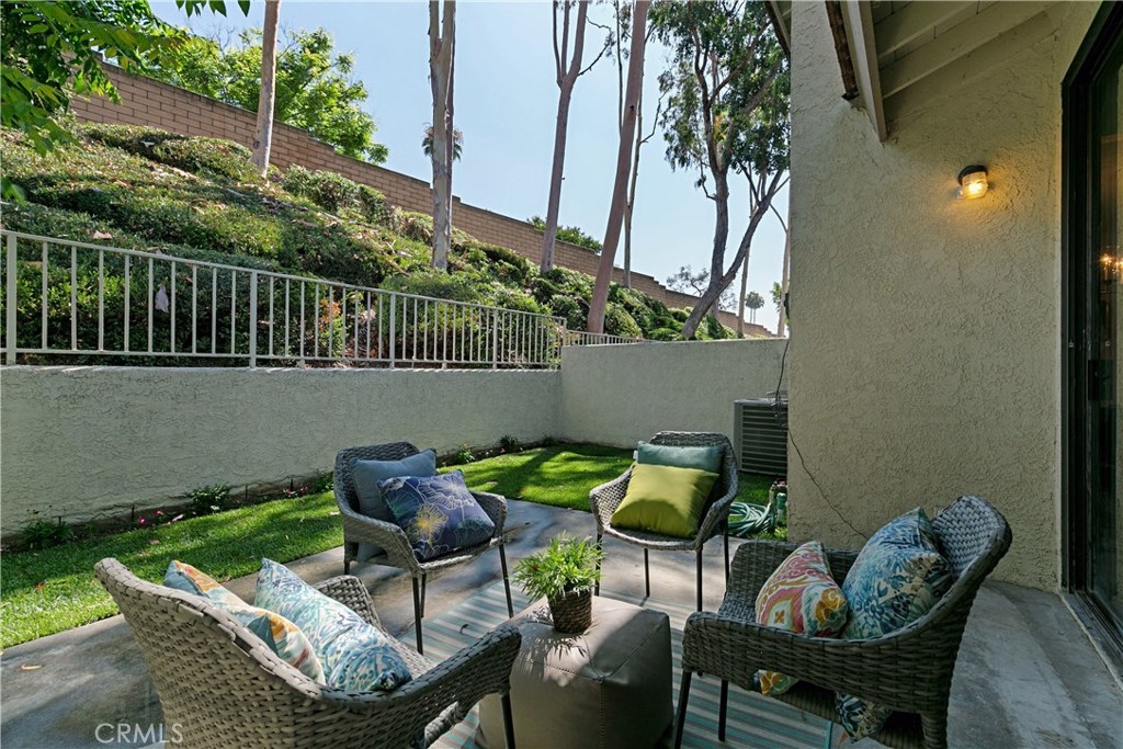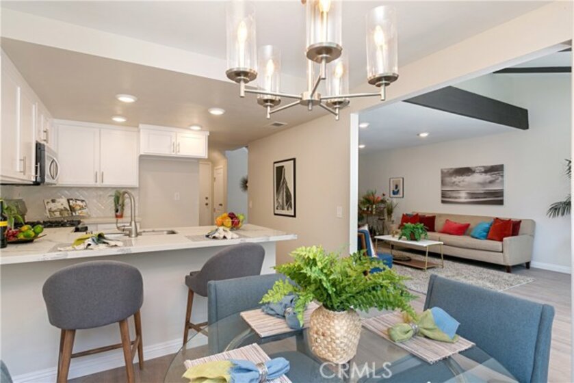 Situated in the coveted Malvern Creek community, this desirable townhouse-style condo has been expertly remodeled. With 2 bedrooms, 2.5 bath & loft you'll find many upgrades throughout including recessed lighting, new stylish laminate flooring and baseboards, new central A/C & heat, and attached 2-car garage with laundry hookups. Upon entry, you are welcomed by vaulted ceilings, an open airy layout, and a herringbone tile foyer. The living room is open on either side providing an effortless flow. Large sliding glass doors lead to your backyard area with concrete patio and new grass. The remodeled kitchen is open to the dining area and has been redesigned with quartz counters, custom white shaker soft close cabinetry, herringbone tile back splash, stainless steel appliances, and breakfast bar. The stylish half bath is located downstairs for your and your guests' convenience. Upstairs, enjoy the spacious loft offering versatile potential for its' use. Adjacent you'll find the remodeled full bathroom with new quartz counters, custom cabinetry, tile floors, and subway tiled bath. The expansive master bedroom is truly a retreat of your own with vaulted ceiling, large walk-in closet, and attached en suite bathroom complete with dual sinks, new quartz counters, custom cabinetry, and frameless glass shower. This well kept community offers a pool and spa. Wonderful location close to award winning schools and shopping and dining of Amerige Heights Town Center.
