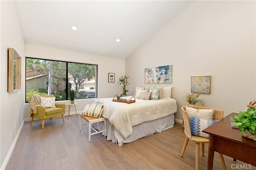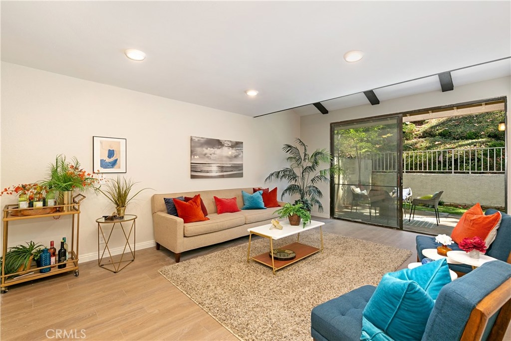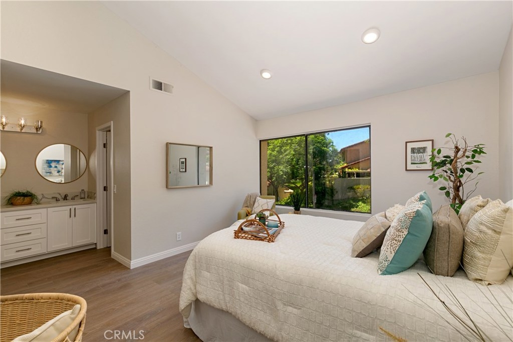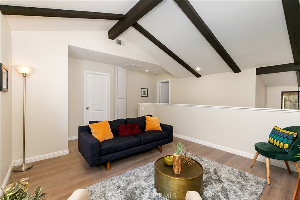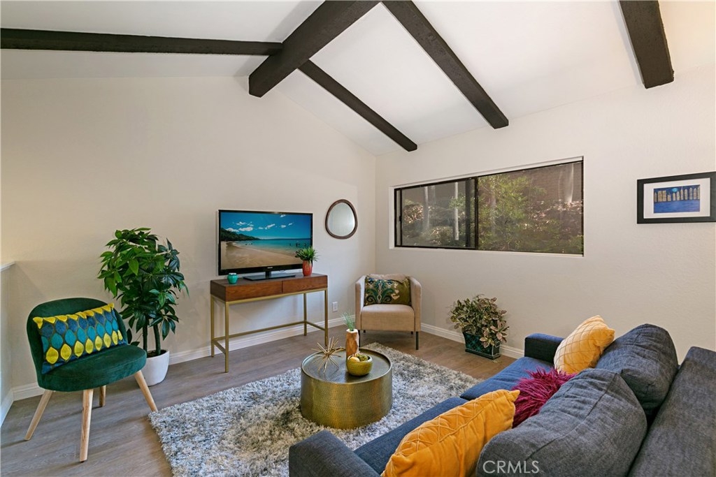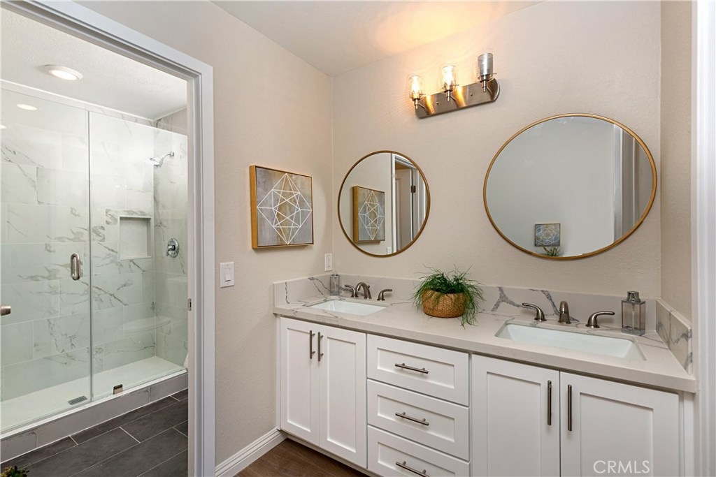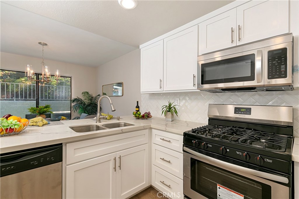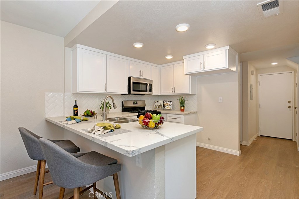 Situated in the coveted Malvern Creek community, this desirable townhouse-style condo has been expertly remodeled. With 2 bedrooms, 2.5 bath & loft you'll find many upgrades throughout including recessed lighting, new stylish laminate flooring and baseboards, new central A/C & heat, and attached 2-car garage with laundry hookups. Upon entry, you are welcomed by vaulted ceilings, an open airy layout, and a herringbone tile foyer. The living room is open on either side providing an effortless flow. Large sliding glass doors lead to your backyard area with concrete patio and new grass. The remodeled kitchen is open to the dining area and has been redesigned with quartz counters, custom white shaker soft close cabinetry, herringbone tile back splash, stainless steel appliances, and breakfast bar. The stylish half bath is located downstairs for your and your guests' convenience. Upstairs, enjoy the spacious loft offering versatile potential for its' use. Adjacent you'll find the remodeled full bathroom with new quartz counters, custom cabinetry, tile floors, and subway tiled bath. The expansive master bedroom is truly a retreat of your own with vaulted ceiling, large walk-in closet, and attached en suite bathroom complete with dual sinks, new quartz counters, custom cabinetry, and frameless glass shower. This well kept community offers a pool and spa. Wonderful location close to award winning schools and shopping and dining of Amerige Heights Town Center.