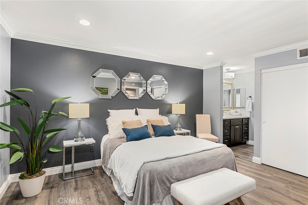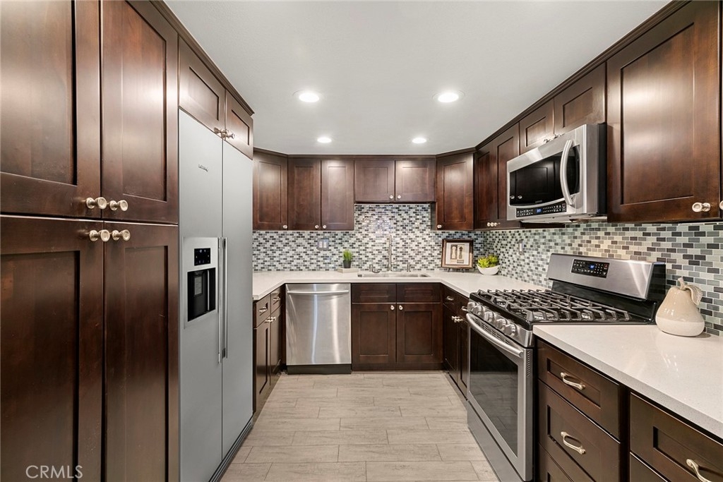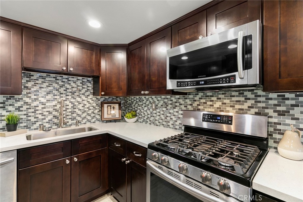 Completely renovated and model perfect. Exceptional ground floor location with convenient access to pool & spa. Dual master bedroom set-up with great open floor plan and separate living and dining areas. Amazing well appointed kitchen with quartz counters, glass tile backsplash, pantry, plenty of soft close cabinetry & counter space, and stainless steel appliances - 5 burner gas range, microwave, dishwasher, sink and fixtures. Wood plank luxury laminate flooring, upgraded base & crown molding, custom paint, gas fireplace, recessed dimmable LED lighting, smooth textured ceilings and much, much more. Newer high efficiency water heater, toilets, and Heating & A/C System with Nest Thermostat. Stylishly upgraded bathrooms include Quartz counter, soft close cabinetry, designer back-lit mirror, custom tile work and newer fixtures. Separate laundry room complete with washer & dryer and storage room w/shelving. Spacious covered patio area complete with lemon tree - a perfect place for relaxing or entertaining. Orange County at it’s finest! Close by to Downton Fullerton, Angel Stadium, Honda Center, Disneyland, Knott's Berry Farm, shopping, entertainment, restaurants and transportation.