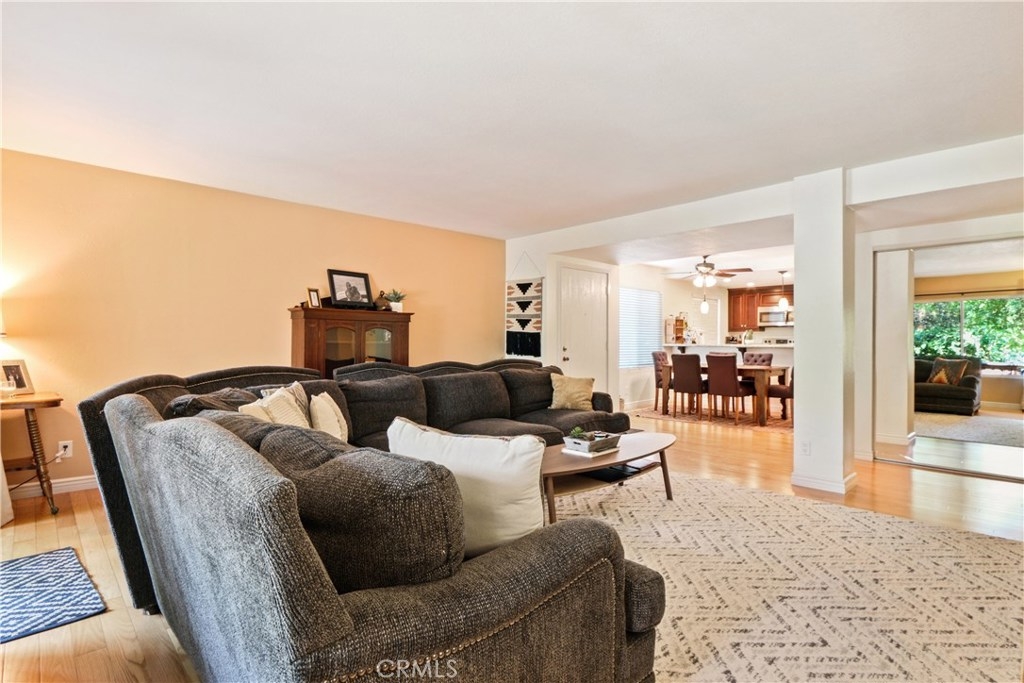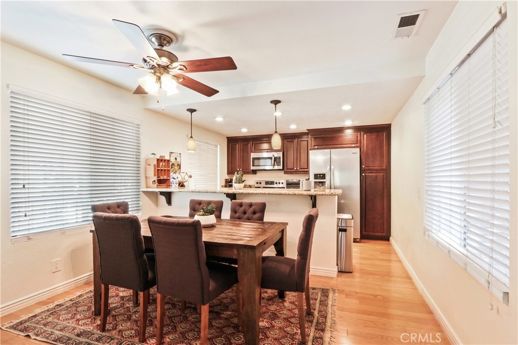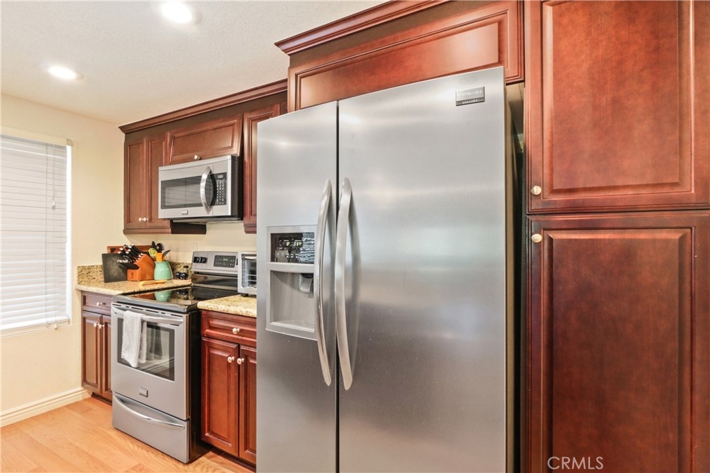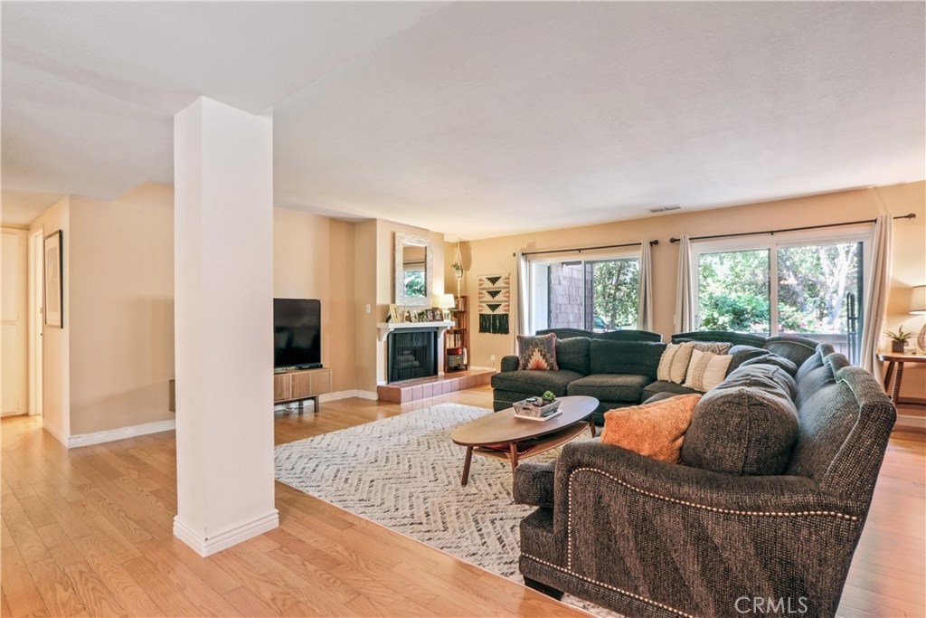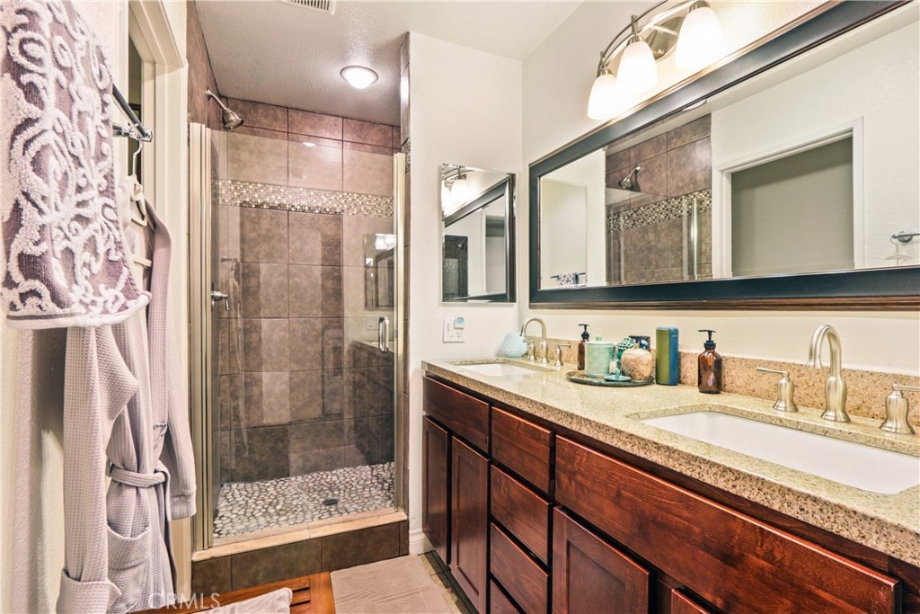 Spectacular remodeled, single story, end unit home! Fabulous open floor plan with an abundance of light. Beautifully remodeled kitchen with gorgeous wood cabinets, granite counter tops, breakfast bar, stainless steel appliances and recessed lighting. Kitchen is open to open to dining room and huge living room with fireplace, large window and slider to patio. Smooth ceilings, beautiful wood floors throughout the living area, newer dual pane windows and sliders throughout. Both bedrooms are spacious with nice carpet and mirrored wardrobe doors. Master bath beautifully remodeled with tile shower with decorative inlay, newer vanity, counter top, dual sinks and tile floor. Nice secondary bath with tiled tub/shower and tile floor. Inside full size laundry hookups. Newer air conditioning will keep you cool. There's a spacious patio off the living room and a very private space for another patio just outside the master bedroom with view (and sound) of waterfall. Sought after Quail Ridge community is lushly landscaped with pine trees, streams, waterfalls, bridges and meandering walkways. This outstanding community offer a clubhouse, pool, spa and tennis court as well as earthquake ins., water and trash included in dues. 2 assigned parking spaces and plenty of guest parking. Fabulous location close to Brea Mall, Craig Park, restaurants, shopping, Fullerton University and 57 fwy