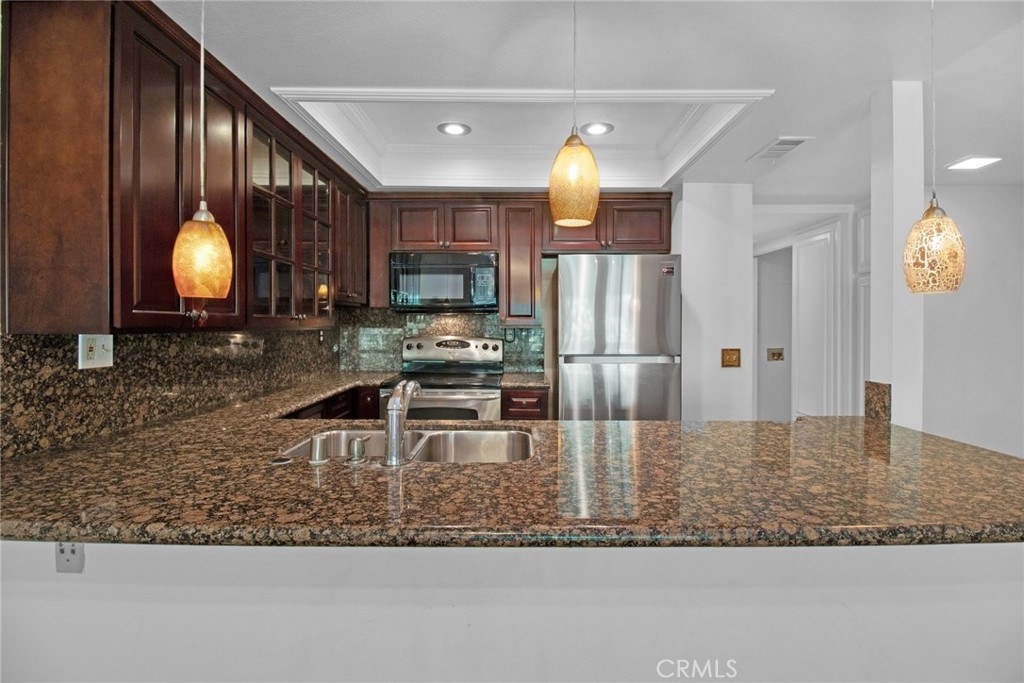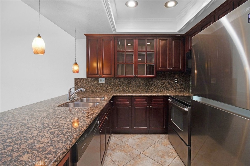Charming 2 bedroom, 2 bathroom, 2 story condo in the resort-like setting of Quail Ridge in Fullerton! Enjoy high ceilings and two spacious balconies, one of which overlooks a tranquil waterfall. The updated kitchen offers granite countertops and backsplash, dark wood custom cabinetry, and stainless steel appliances. The primary bedroom features high ceilings, a balcony, a shower-in tub in the primary bathroom, and a large closet. Sliding doors from the living room and the primary bedroom lead to the neighborhood view balconies. Additional property features include in-unit laundry hookups and 2 assigned carport spaces. Community amenities include a swimming pool, a spa, tennis courts, and a clubhouse. Convenient to nearby schools, shopping, Fullerton Golf Course, Cal State Fullerton, and the 57 freeway!