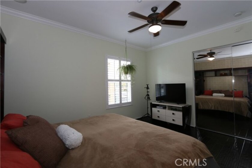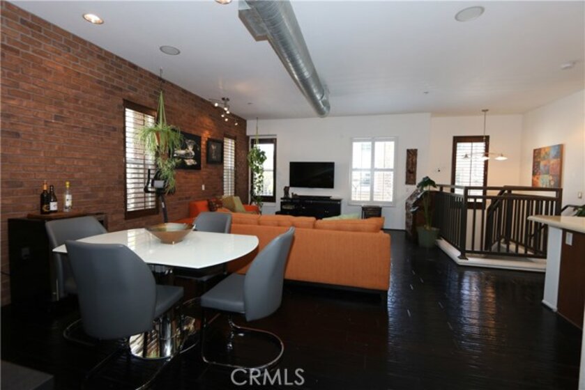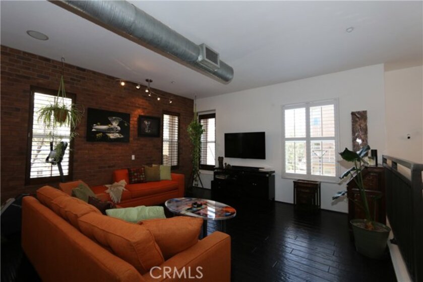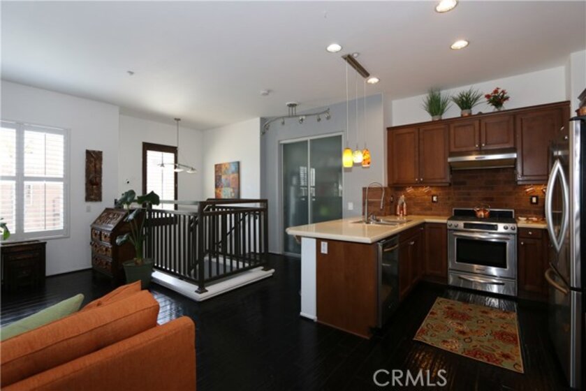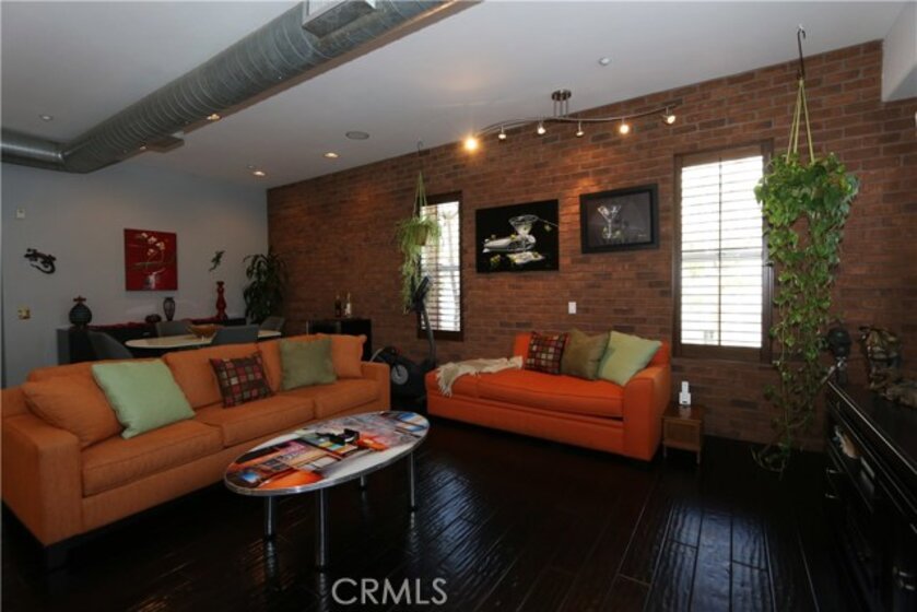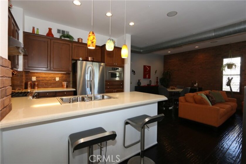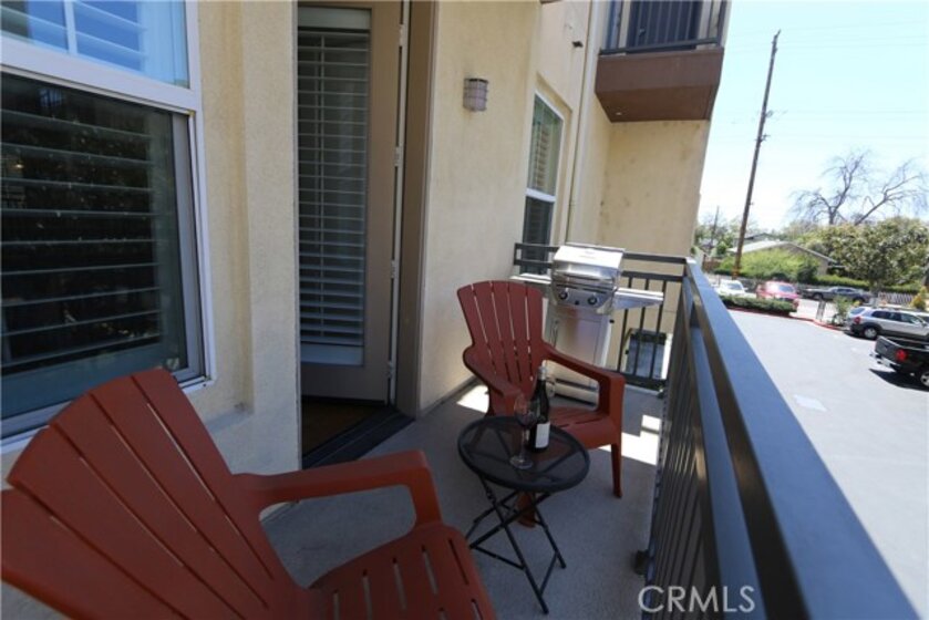 Style and Class is what's offered in this Former Model 2 bedroom, 2 1/2 bath with office condominium located in Soco Walk Complex. This place is ideal for anyone who is looking for low maintenance living with the luxury of a grand office away from home (downstairs), but yet at home! This lovely condo is very welcoming with the warmth of plantation shutters, beautiful dark wood flooring and an entertainers delight with ceiling speakers throughout. The kitchen is open to the Living room and Dinning area, both featuring recess lighting. The master bedroom offers a large slider closet and master bath with separate shower and soaking tub with beautiful custom wallpaper. The laundry space accommodates a full size stackable washer and dryer (included) and is located conveniently in the hall way. The second bedroom is also spacious and features a custom cork ceiling and a French door that exits to a decent size balcony where you can BBQ and enjoy a refreshing drink. The garage has it's own custom touches with grey Epoxy Flooring and custom cabinets that can easily be moved around to your liking, with a section to accommodate your tools for easy access. The location is another plus as it's walking distance to Downtown Fullerton and the Metro Link Train Station. "What a great place to Live, Work and Play!"