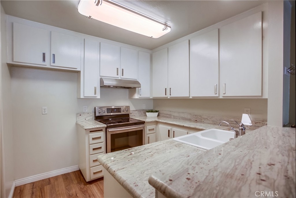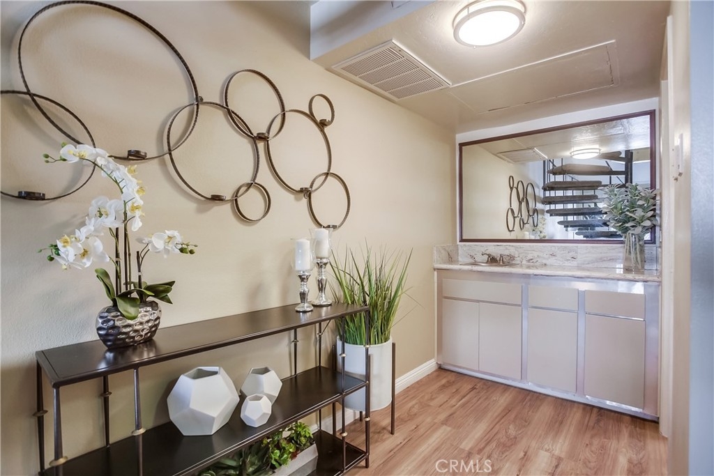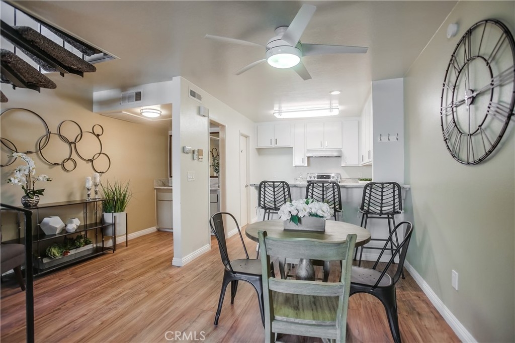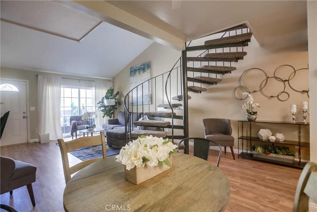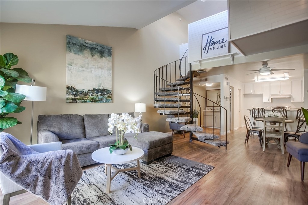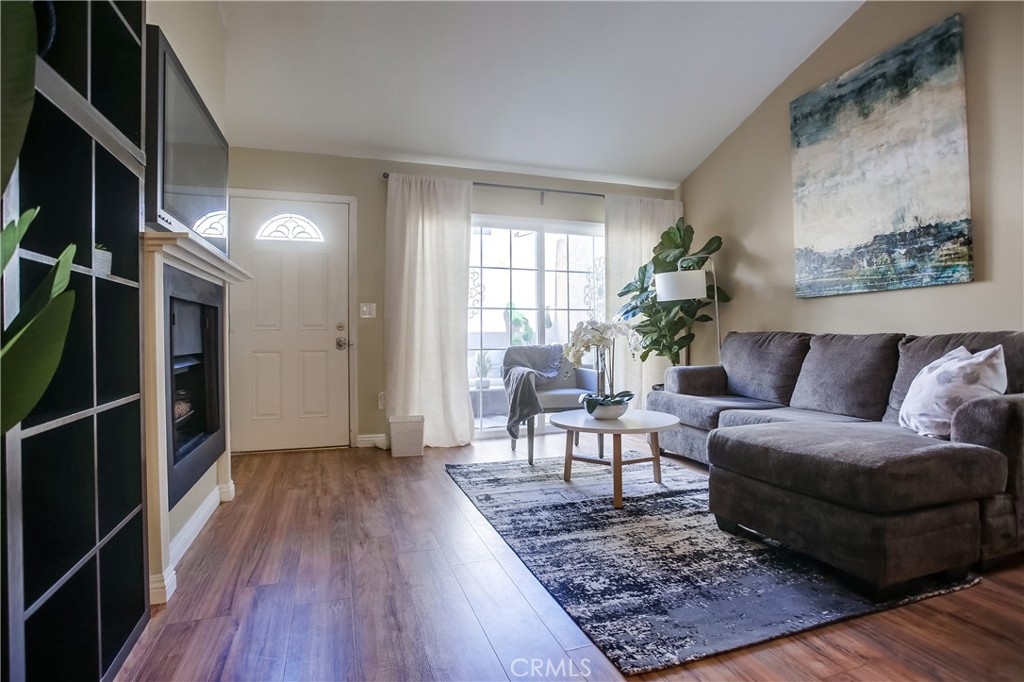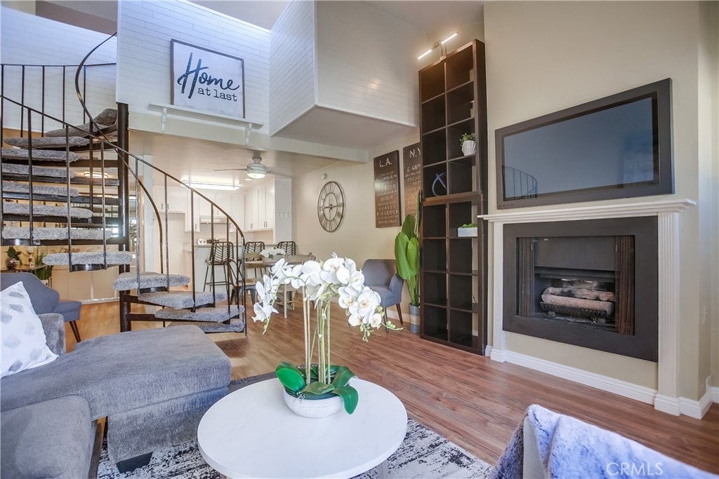 Gorgeous updated and pristine home with recent improvements located in desirable Arbor Condos gated community, ideally located in the heart of Fullerton close to Downtown Fullerton, Cal State Fullerton, Brea Mall, Downtown Brea, Train Station, Shopping, Dining, Bars, recreation, and easy freeway access. The gated front entrance, colorful manicured landscaping, and picturesque bubbling fountain welcome you through this well-maintained community. A vibrant green outer door welcomes you through to the private and serene front courtyard, pass through the front door with charming leaded glass sidelight into the home where the vaulted ceilings and light filled interior will take your breath away. Some of the many fine features throughout this well-designed open-concept floor plan include beautiful new laminate floors on both levels, new baseboards throughout, new light fixtures, new carpet, and a freshly painted interior with handsome accent walls, all creating the perfect living environment. The living area boasts a cozy fireplace and dual pane sliders opening to the patio creating a superb indoor-outdoor living space for entertaining and relaxing with family and friends. The light and bright kitchen is blessed with granite countertops, updated hardware and fixtures, new stainless-steel stove and hood, and a prized breakfast bar, all open to the dining area and the living area. Main level features also include a wet bar and a spacious pantry closet. The chic winding staircase leads up to the second level with sleek floors and an open light-filled bedroom with a sunny nook perfect for a home office space, a large walk-in closet, and a beautifully updated bathroom with framed vanity mirror, new custom lighting, and a large bathtub shower enclosure with new shower head. 1 assigned covered carport #121 with a storage space. Excellent community amenities include a sparkling community pool and spa, laundry facilities, sauna, clubhouse, billiards, Gym, and rec room for private parties and community gatherings. HOA dues include Gas, Water, and Trash!