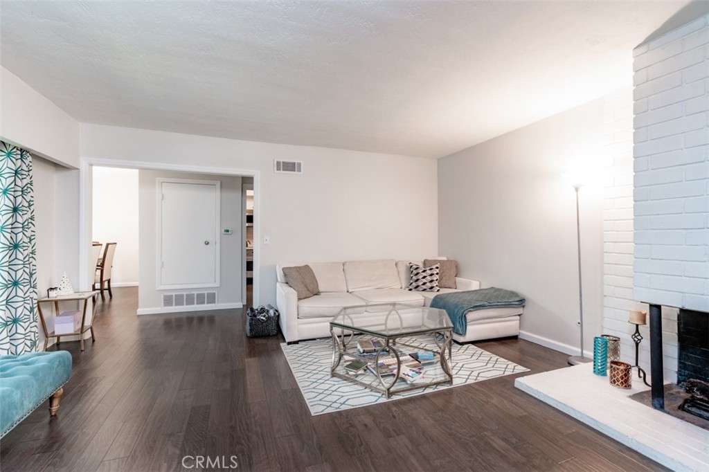 Beautifully upgraded, upper level, end unit Condo in the Meredith Manor complex. This 1 bedroom, 1 bathroom condo offers a spacious floor plan with a large living room with wood burning fireplace, a nice sized kitchen, separate dining room and your own private balcony. The bedroom offers a full size closet and there are 2 closets in hallway for plenty of storage space. This home has been update with hardwood flooring, new kitchen cabinets, quartz countertops and high end stainless steel GE appliances, new bathroom vanity with quartz countertop and new shower door. Complex grounds are well-maintained with nice green grass and trees and shrubs throughout, 4 swimming pools and locked laundry room. One car garage space with built-in cabinets for extra storage. Walk to tons of shops and restaurants and just minutes from Downtown Fullerton and Cal State Fullerton.