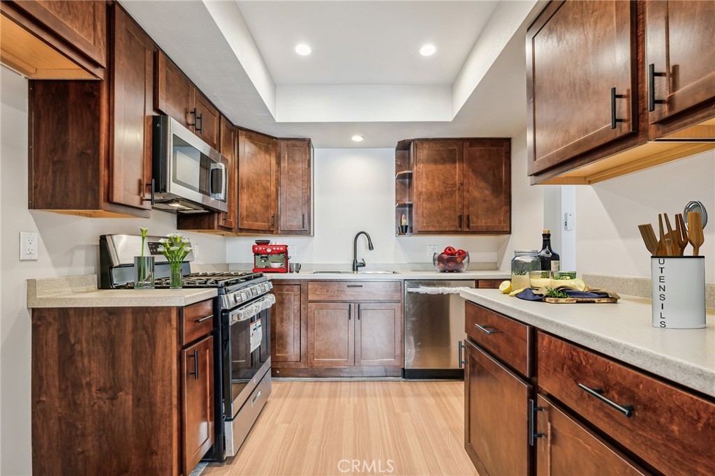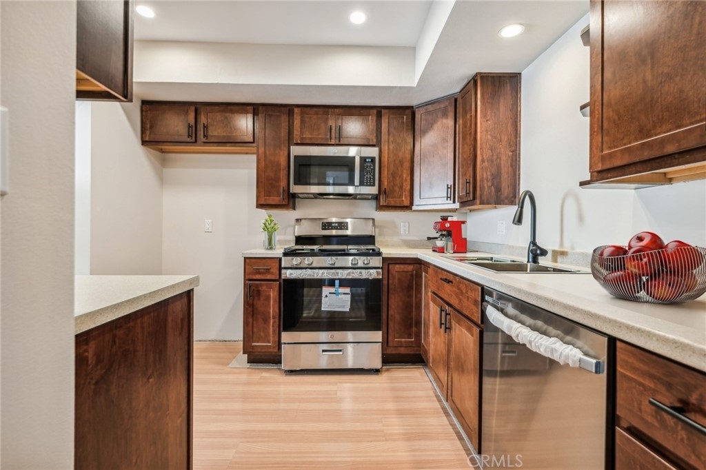 READY TO MOVE IN -Spacious 2br 2ba residence updated with new kitchen and appliances. Great Floor Plan with large rooms and windows. One car garage space. EZ living for commuters near freeway access. High walkability score. Near everything-Costco, Gyms, Amazon Fresh, Walmart, Best Buy. Restaurants of every kind. Walk across the street to the famous Broken Yolk Café for Breakfast and Lunch. Nice sized balcony that is semi private. Beautiful Mature Landscaping, Pool with Peaceful and green walkways in common areas. HOA includes water, trash, sewer, landscaping, pool maintenance and more. One car garage space. No seller contingencies- Ready For Move In. furnishings virtually staged by Padstyler.com. 165 feet from Bowling Alley. Walk to Blaze Pizza, Lowes, McDonalds, Denny's. 24 Hour Fitness is across street on Lemon. Keep a scooter with a basket in the garage for nearby places.