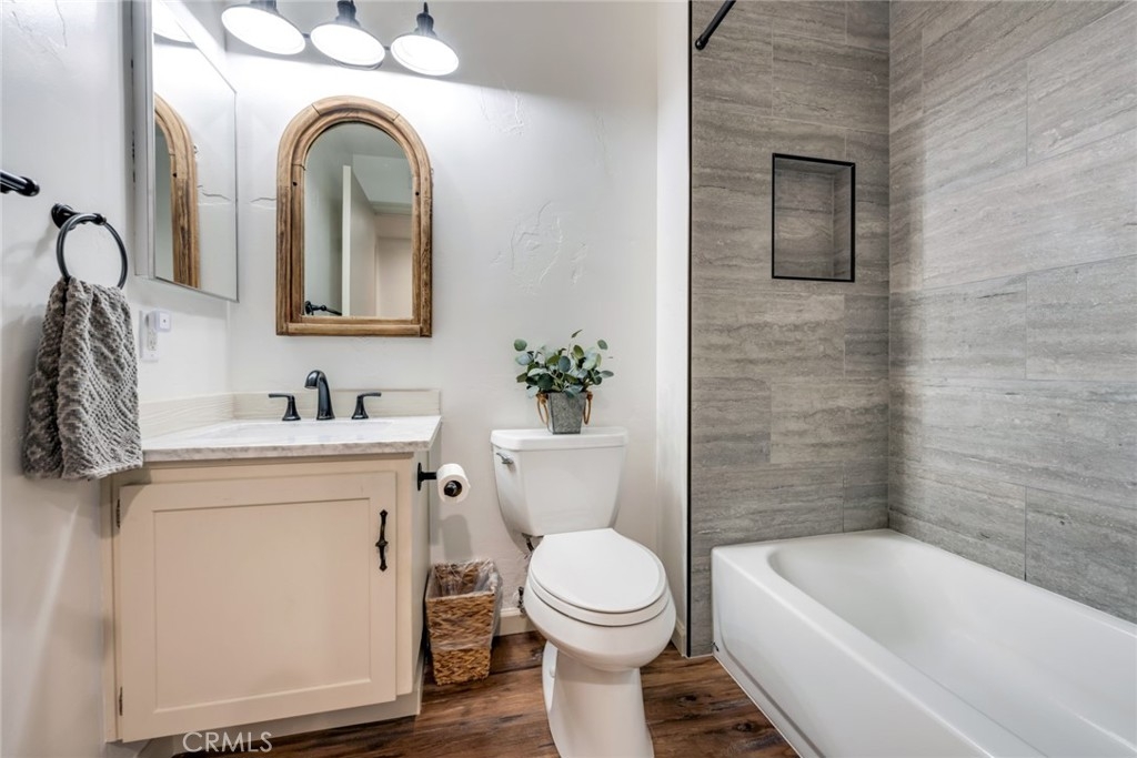 Welcome home to this beautifully upgraded condo in the Quail Ridge Community located in the city of Fullerton. The community offers an atmosphere of tranquility with mature trees, creeks, waterfalls, and walking paths. The condo is conveniently located within close proximity to Craig Regional Park, CSUF, Brea Mall, and major freeways. As you enter the second story unit you are greeted by an open floor plan with vinyl wood-look flooring, vaulted ceilings in the family room, and a tree lined view out of the rear sliding glass door. Relax on the spacious rear deck and listen to the nearby waterfall. The remodeled kitchen features beautiful quartz countertops, a copper farmhouse sink, newer stainless-steel appliances and range hood, new tile backsplash, painted cabinets, and an extended walk-in pantry underneath the stairs. The remodeled bathroom is located downstairs next to the main bedroom and features a new shower and bathtub combo with upgraded tile, a quartz countertop vanity, and new fixtures. As you walk up the newly refinished wood stairs, you will find a loft complete with a closet and covered deck. This space is perfect for a second bedroom, nursery, office, playroom, or workout area. The owners remodeled this condo with beauty, function, and storage in mind. Come and see all of the additional upgrades like extra sound proofing in the floor and stairs, retextured walls, recessed lighting, hidden pet area underneath the stairs, shoe storage on the first step of the staircase, and a permitted storage shed in the atrium area of the condo. This beautiful condo will not last long!