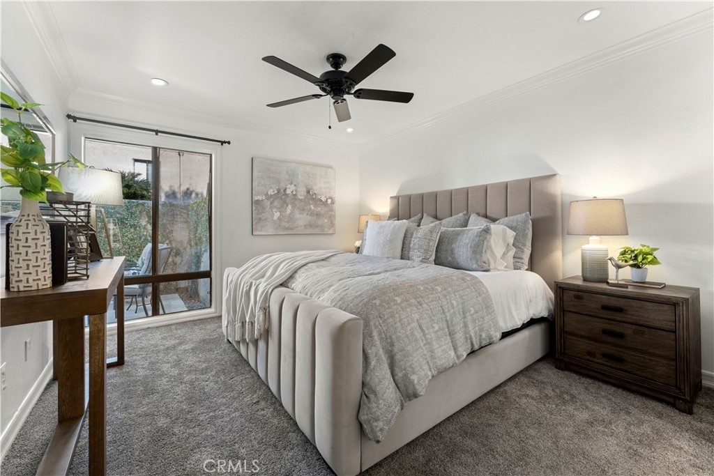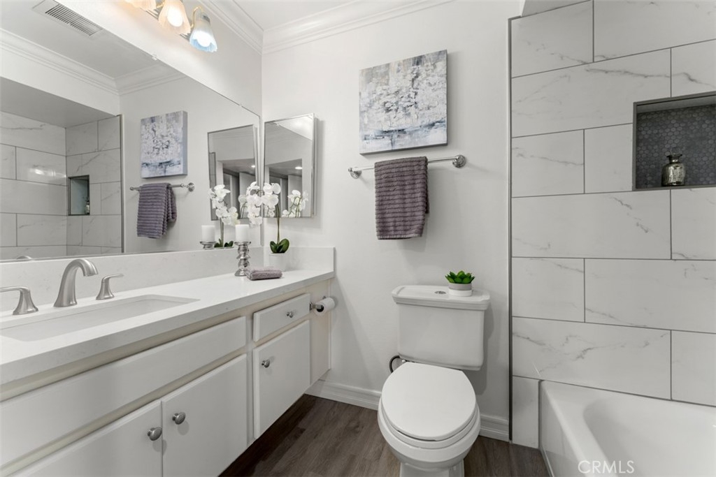Welcome to this beautifully remodeled and move-in ready home in the sought after gated community of Park Ridge. This first level condo boasts dual master suites, each with its own upgraded bathroom and complete with the perfect open floor plan with upgraded kitchen, with center island, new flooring throughout and brand-new A/C! From the moment you walk in to the private and gated front patio, you’ll be greeted by the bright, airy, and spacious layout with tons of natural light and oversized windows. New luxury vinyl plank flooring welcomes you into the spacious living room leading into the kitchen and dining area. Newer wood cabinets with dove-tail drawer construction and plenty of storage space with custom counter tops, and modern backsplash, make this floor plan ideal for easy and comfortable living. The spacious bedrooms, conveniently located away from the common areas have also been upgraded with new carpet, recessed lighting in every room, ceiling fans, crown molding and custom baseboards. Each master suite offers very spacious closets with mirrored doors, leading into their own upgraded bathrooms with new quartz countertops, high end fixtures, new toilets, modern new tile, including a beautiful shower glass enclosure in one of the bedrooms with direct access to the patio for added privacy and convenience. This home is centrally located within the community with quick access to 1 car garage, pool, spa, club house, gym, tennis and basketball courts and convenient laundry area. This home is perfect for a first-time home buyer or college student looking to live in a great neighborhood, with excellent school district, super close to CSUF, Brea Mall, restaurants, grocery & retail stores and directly across from Craig Regional Park with Lake! Super dog friendly community, with water and trash included and LOW HOA.